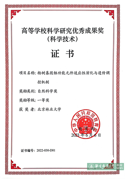 生物学院张德强教授团队完成的“杨树基因组功能元件适应性演化与遗传调控机制”获自然科学奖一等奖。该成果以我国重要乡土树种毛白杨与小叶杨全国种质资源群体为材料,率先揭示了杨树种源适应性驱动下的基因组演化开发了一系列环境适应性选择元件与功能模块,为杨树“优质、高抗、广适”分子设计育种技术体系开发与优良种质定向选育奠定了关键理论基础与技术支撑。