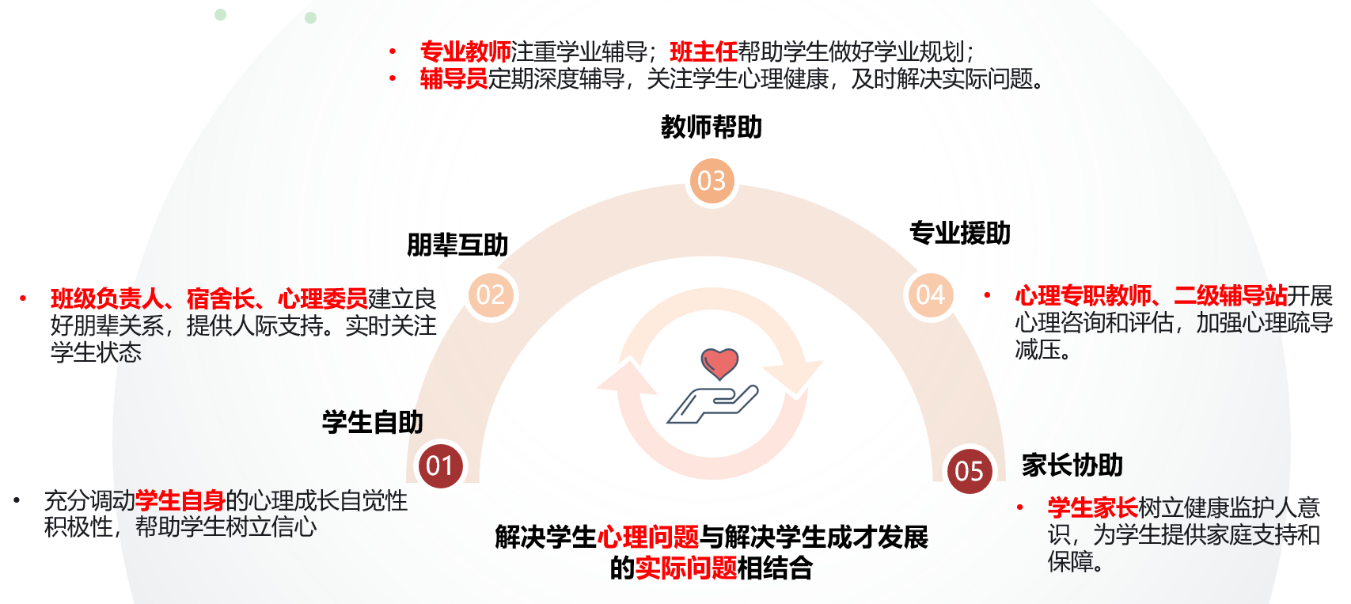 全员心理育人“五助工作法”是我校水保学院在解决成长困境型学生心理健康问题长期实践中总结形成的典型做法。重点突出“以人为本”教育理念,坚持“党委统筹、全员参与”工作思路,把解决心理问题与解决成才发展的实际问题相结合,协同发挥各类群体的育人功能和作用,通过教育学生自助,突出学生心理健康主体地位,调动学生心理成长的自觉性和积极性;指导朋辈互助,发挥朋辈辅导情感共鸣优势,营造“助人-自助-互助”健康氛围;引导教师帮助,发挥各类教师群体作用,打造全员全方位育人工作链条;实施专业援助,完善校院心理工作沟通机制,协调联动应对心理危机;争取家长协助,帮助家长树立学生健康监护人意识,凝聚家校合力支持学生成长发展,着力构建全员参与的心理育人格局,为学生健康成长提供支持保障。