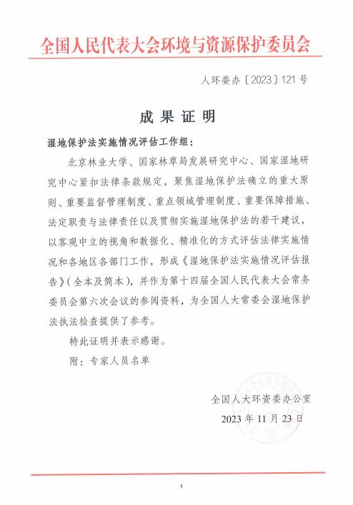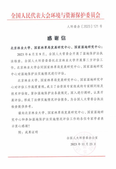 近日,我校收到全国人民代表大会环境与资源保护委员会发来的感谢信,信中对我校牵头开展湿地保护法实施情况评估工作表示感谢,并附上了成果证明和专家人员名单。