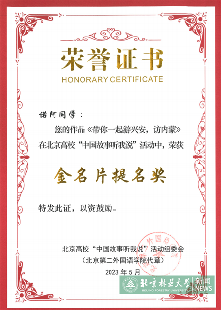 近日,在北京市委教育工委主办的北京高校“中国故事听我说”中外学生讲述新时代中国故事活动中,我校两名国际学生双双获得“金名片提名奖”。