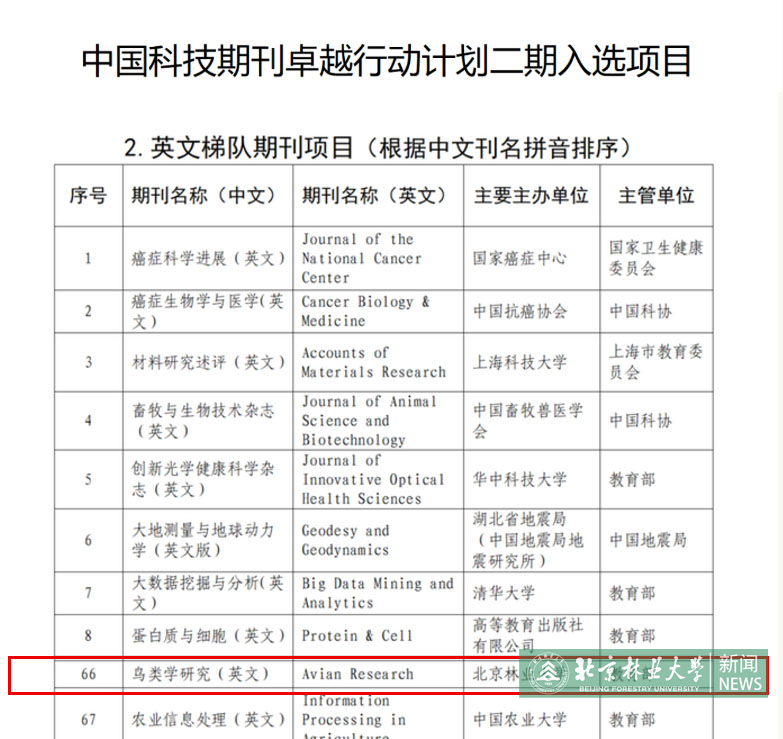 日前,中国科技期刊卓越行动计划二期入选项目名单公布。我校主办的《森林生态系统(英文)》(Forest Ecosystems)首次入选英文领军期刊项目,《鸟类学研究(英文)》(Avian Research)入选英文梯队期刊项目。这是我校在卓越行动计划第一个建设周期中获批两项英文梯队项目后取得的又一重大突破,进一步彰显了我校在国家科技期刊建设中的学术实力和国际影响力。