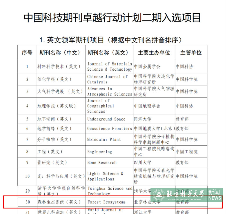 中国科技期刊卓越行动计划由中国科协、教育部、科技部、财政部、国家新闻出版署、中国科学院、中国工程院共同实施。该计划作为迄今为止国家在期刊领域实施的力度最大、资金最多、范围最广的重大支持专项,以建设世界一流科技期刊为核心目标,是在国家层面推动科技期刊高质量发展的战略举措。自2019年项目启动实施以来,经过第一个五年周期的建设,我国高水平科技期刊数量显著增长。目前,全国共计5000多种科技期刊,1340种高水平期刊参与申报,最终463项入选。此次第二期卓越项目(2024—2028)设置英文单刊、中文单刊、高起点新刊、高水平办刊人才培育、集群(集团)化试点5个子项目,实施周期为5年。其中英文领军期刊共50种,教育系统共有9所高校有项目入选,其他入选单位主要分布在中国科学院和各行业学会,我校是林业领域唯一入选英文领军期刊的单位,同时在高校入选期刊总数排名中并列第16。