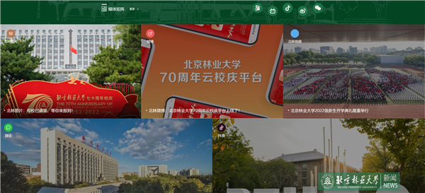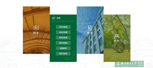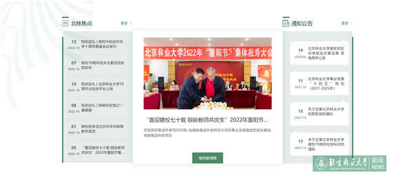 新版门户网站突出新闻展示与功能检索相融合的整体思路,以我校视觉形象识别系统的“北林绿”为主基调。网站分为题图展示、新闻速览、党建专题、教学科研、媒体矩阵、基础数据等6大模块,各个模块以我校视觉形象系统中的“山”“水”“木”“人”元素相串联,构建出生生不息、欣欣向荣的视觉效果。