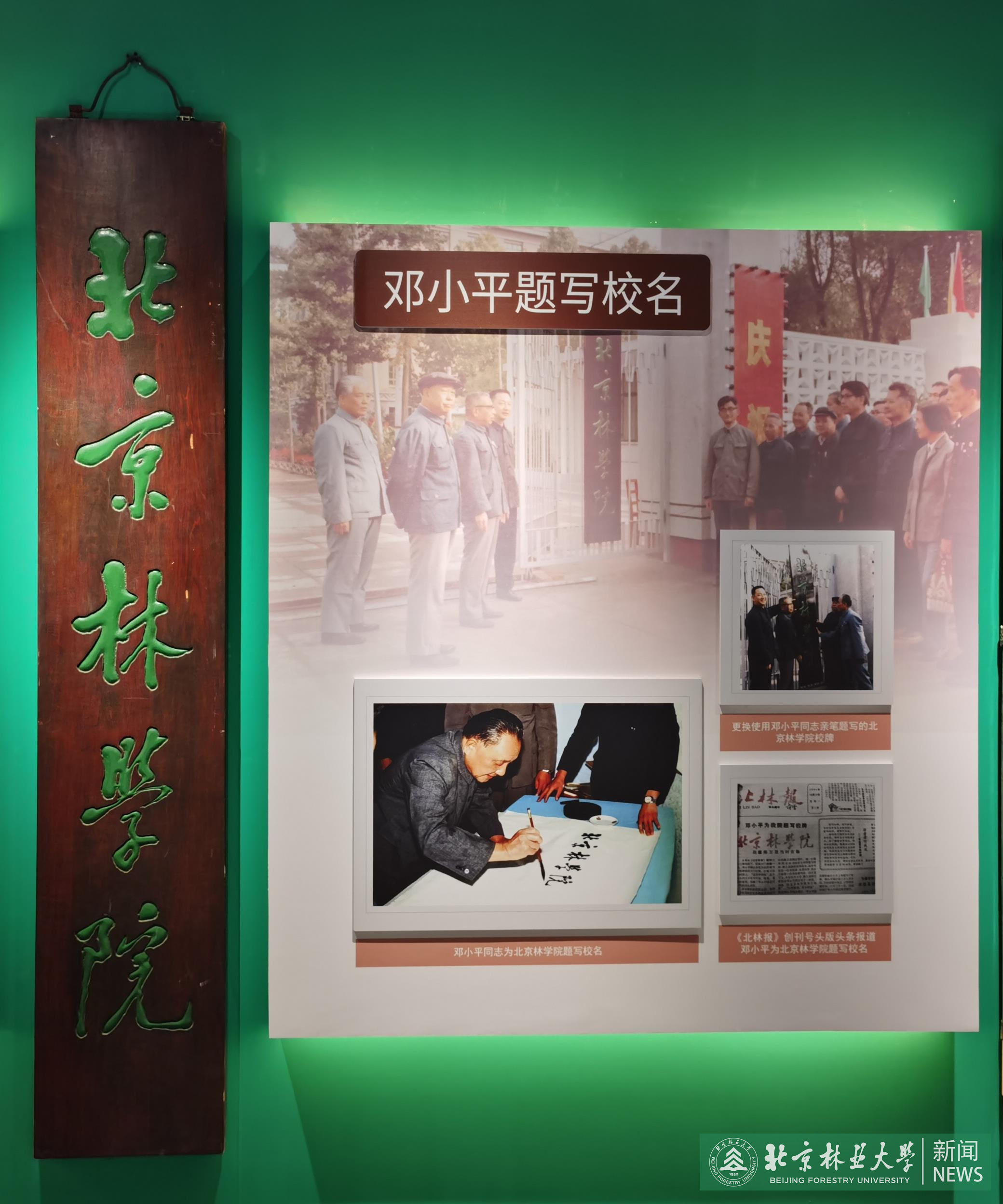 由邓小平同志亲笔题写的校名“北京林学院”在校史馆序厅展出,题字制作的学校牌匾在第三展厅展出。