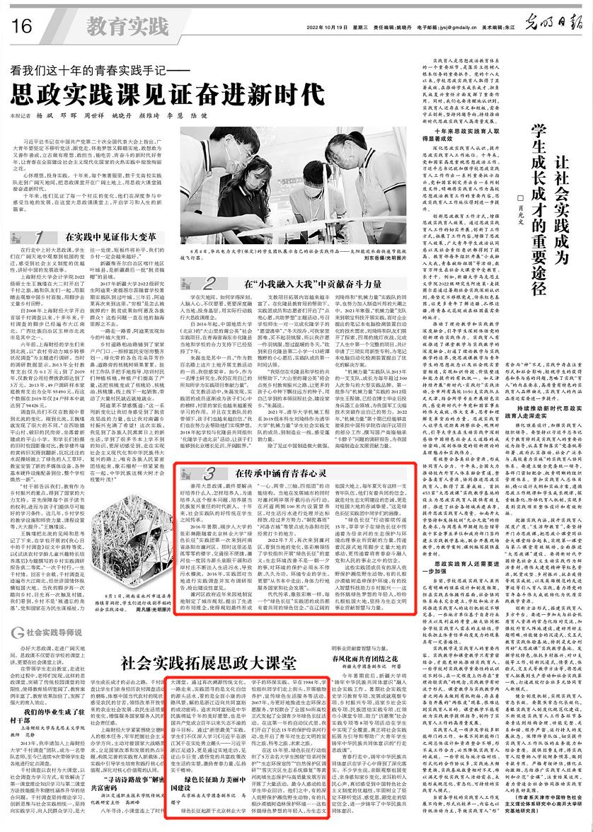 喜庆党的二十大,传承奋进新征程。在我校迎来建校70周年华诞之际,《光明日报》以《思政实践课见证奋进新时代》和《社会实践拓展思政大课堂》为题报道我校主动适应国家生态文明建设需求,开展绿色长征,助力美丽中国建设,在社会实践中深入学习贯彻习近平生态文明思想,拓展思政大课堂的做法。
