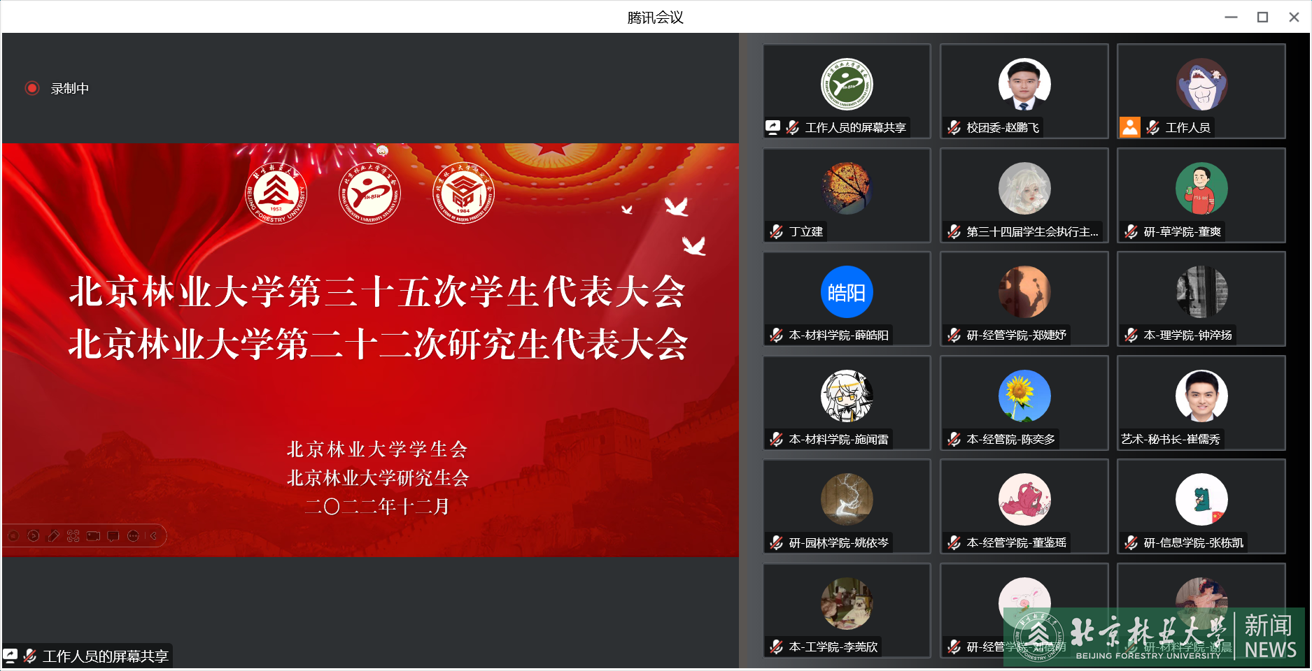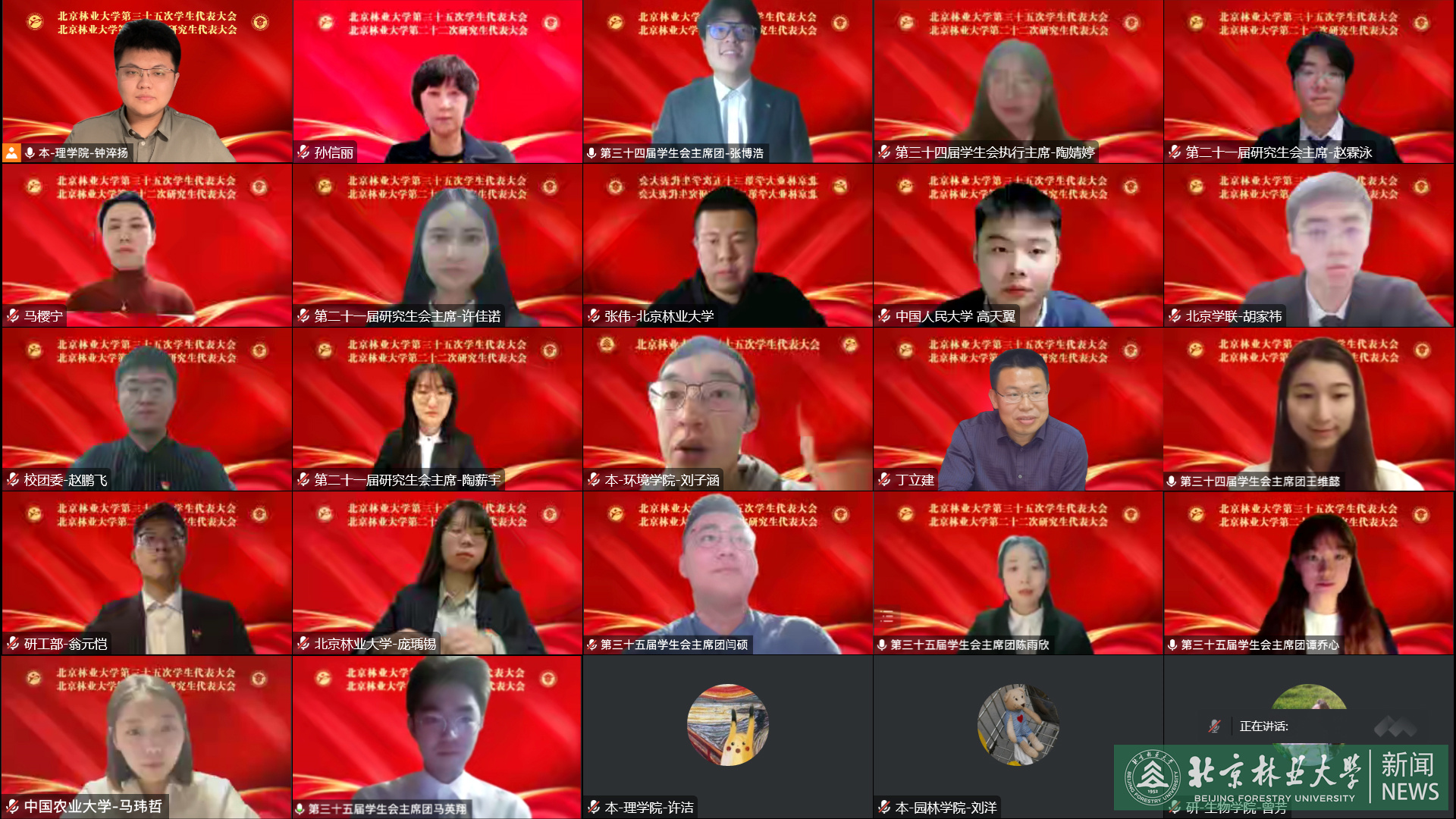 12月26日,我校第三十五次学生代表大会、第二十二次研究生代表大会在线上隆重召开。校党委副书记孙信丽、北京市学生联合会驻会执行主席胡家祎、中国人民大学学生会执行主席高天翼、中国农业大学研究生会执行主席马玮哲,以及校团委、研工部负责人出席会议。来自全校各学院、各年级及主要学生社团的193名正式代表和来自青年志愿者、创新创业、学生媒体、艺术团等学生列席代表参加会议。