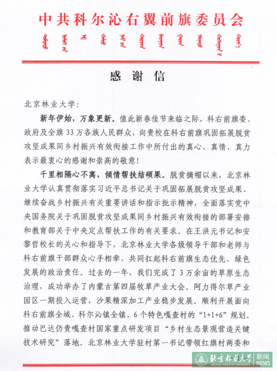 新年伊始,万象更新。值此新春佳节来临之际,科右前旗委、政府及全旗 33 万各族人民群众,向贵校在科右前旗巩固拓展脱贫攻坚成果同乡村振兴有效衔接工作中所付出的真心、真情、真力表示最衷心的感谢和崇高的敬意!