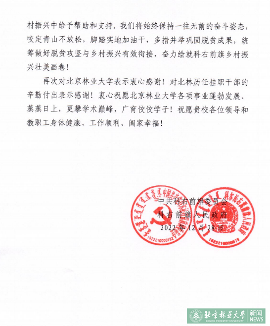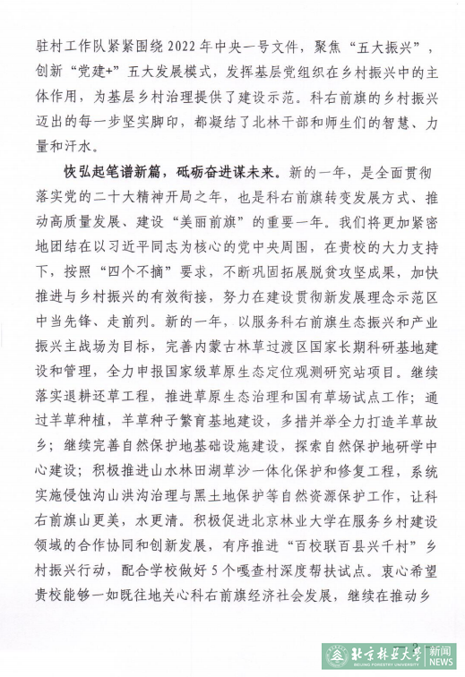 恢弘起笔谱新篇,砥砺奋进谋未来。新的一年,是全面贯彻落实党的二十大精神开局之年,也是科右前旗转变发展方式、推动高质量发展、建设“美丽前旗”的重要一年。我们将更加紧密地团结在以习近平同志为核心的党中央周围,在贵校的大力支持下,按照“四个不摘”要求,不断巩固拓展脱贫攻坚成果,加快推进与乡村振兴的有效衔接,努力在建设贯彻新发展理念示范区中当先锋、走前列。新的一年,以服务科右前旗生态振兴和产业振兴主战场为目标,完善内蒙古林草过渡区国家长期科研基地建设和管理,全力申报国家级草原生态定位观测研究站项目。继续落实退耕还草工程,推进草原生态治理和国有草场试点工作;通过羊草种植,羊草种子繁育基地建设,多措并举全力打造羊草故乡;继续完善自然保护地基础设施建设,探索自然保护地研学中心建设;积极推进山水林田湖草沙一体化保护和修复工程,系统实施侵蚀沟山洪沟治理与黑土地保护等自然资源保护工作,让科右前旗山更美,水更清。积极促进北京林业大学在服务乡村建设领域的合作协同和创新发展,有序推进“百校联百县兴千村”乡村振兴行动,配合学校做好5个嘎查村深度帮扶试点。衷心希望贵校能够一如既往地关心科右前旗经济社会发展,继续在推动乡村振兴中给予帮助和支持。我们将始终保持一往无前的奋斗姿态,咬定青山不放松,脚踏实地加油干,多措并举巩固脱贫成果,统筹做好脱贫攻坚与乡村振兴有效衔接,奋力绘就科右前旗乡村振兴壮美画卷!