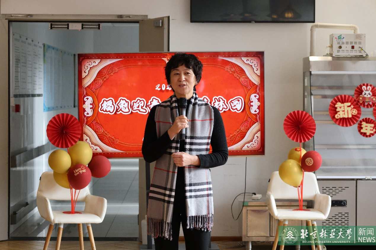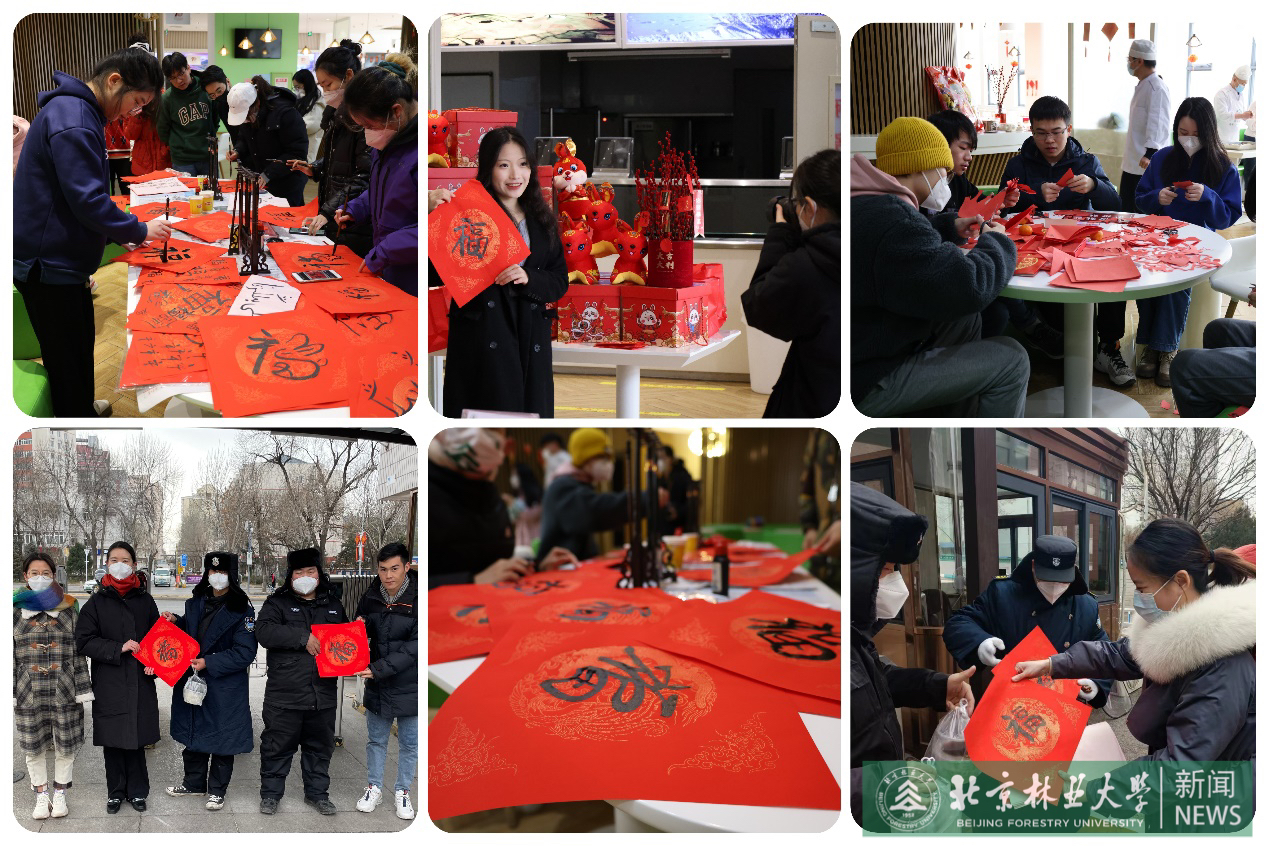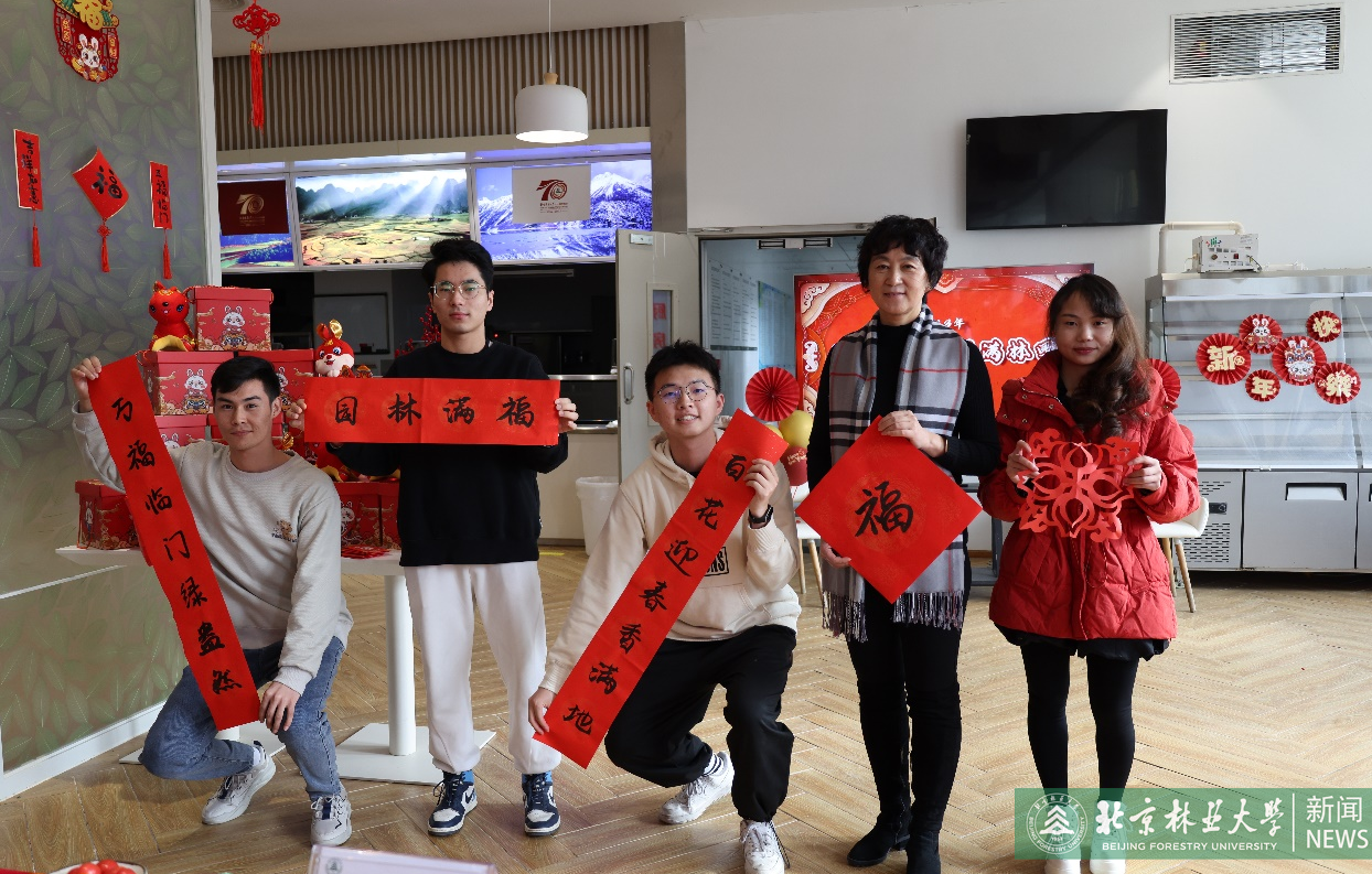 团拜会暖意融融,年味十足。师生共同写福字、剪窗花、包饺子,学生代表汇报了留校过年的学习生活情况及新年期许。会上,学生代表为领导、老师、厨师代表送上自己写的福字、剪的窗花,感谢老师、员工们的辛勤付出和关心关爱,祝福北林“福满林园”;校园内,学生代表把用心包好、第一锅出炉、热气腾腾的饺子和写好的福字送到了学校各个校门值岗的保安员和各公寓楼宿管员的手中,同时送上心意满满的感谢和祝福。
