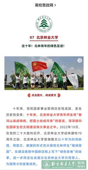 日前,由教育部主管、教育部思政司指导的全国高校思想政治工作网公布高校重点建设公众号优秀原创内容评选结果,我校官微申报推文《这十年!北林青年的绿色足迹!》荣获“十佳”原创内容(全国高校每月仅10篇)。在2022年公众号优秀原创内容评选中,我校官微已获得“十佳”原创4次,在高校重点建设公众号中表现优异。