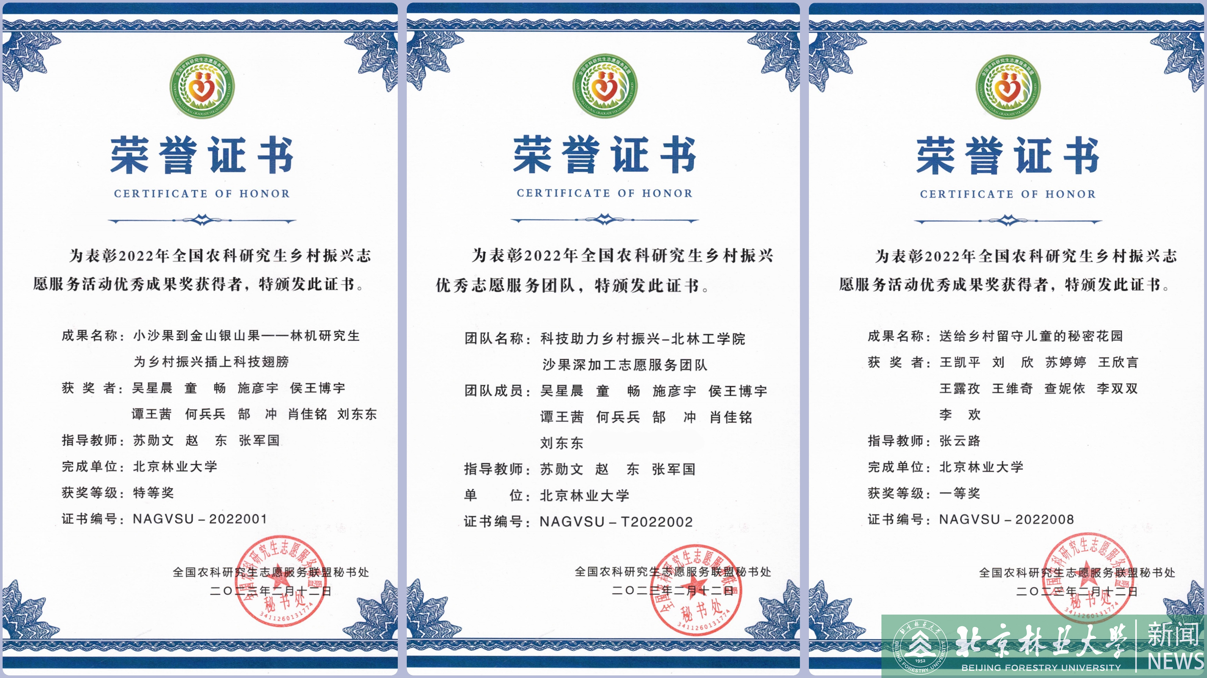 近日,2022年全国农科研究生乡村振兴志愿服务活动优秀案例和优秀团队评选结果公布,我校工学院“科技助力乡村振兴—北林工学院沙果深加工志愿服务团队”获评优秀志愿服务团队,该团队的项目“小沙果到金山银山果——林机研究生为乡村振兴插上科技翅膀”获得优秀成果特等奖;园林学院“送给乡村留守儿童的秘密花园”项目获得优秀成果一等奖。