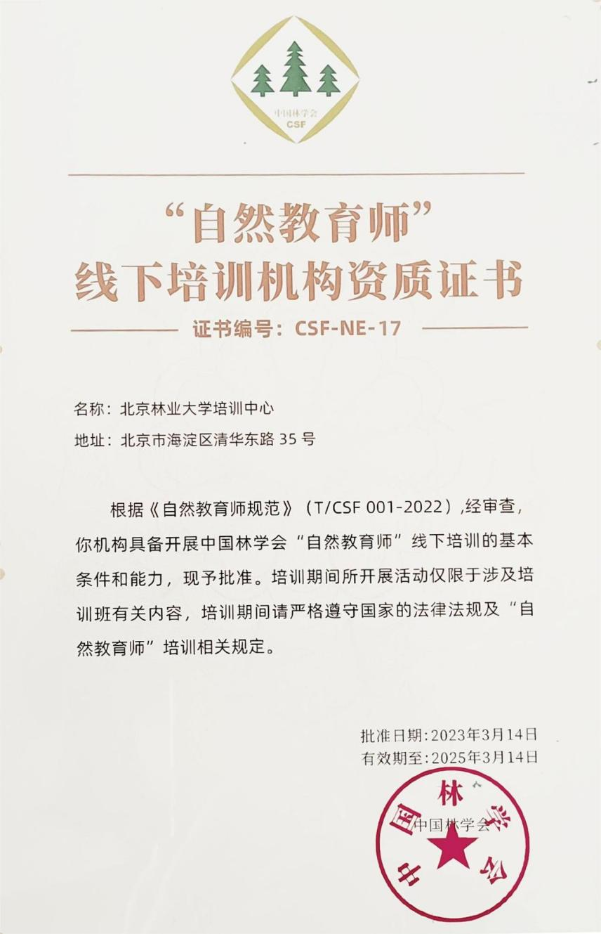 北京林业大学培训中心成立于1997年,是以北京林业大学优势学科为依托,融合校内外优质教学资源,为举办高水平、深层次、多领域的高端培训项目而专门设立的职能机构,目前已经设置了生态文明理论与实践、森林生态旅游、生物多样性保护等数十门自然教育相关课程。培训中心将以此次获批“自然教育师”培训资质为契机,开展更多高质量培训,为推动行业健康发展和生态文明建设添砖加瓦!