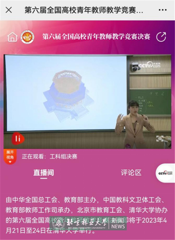 在竞赛中,戴璐参赛课程为《中国古代木结构建筑》,课程秉承“在坚守中传承,在传承中创新”的思政理念,将优秀传统文化融入课堂,在重构教学内容、增强互动体验、提升学习实效等方面独具特色,呈现了一场精彩的课堂教学。全国高校青年教师教学竞赛每两年举办一次,是当前参与面最广、学科门类最全、组织规模最大的全国性高水平教学类竞赛。本届竞赛1800多所高校近50万名青年教师参加了校(院)、市、省等多层级比拼,1501所学校的8550名选手进入省级选拔赛,每个组别均由各省(区、市)选拔1名教师参赛。戴璐曾获北京高校第十二届青年教师教学基本功比赛(工科类)一等奖第一名、最佳教案奖、最佳现场展示奖。