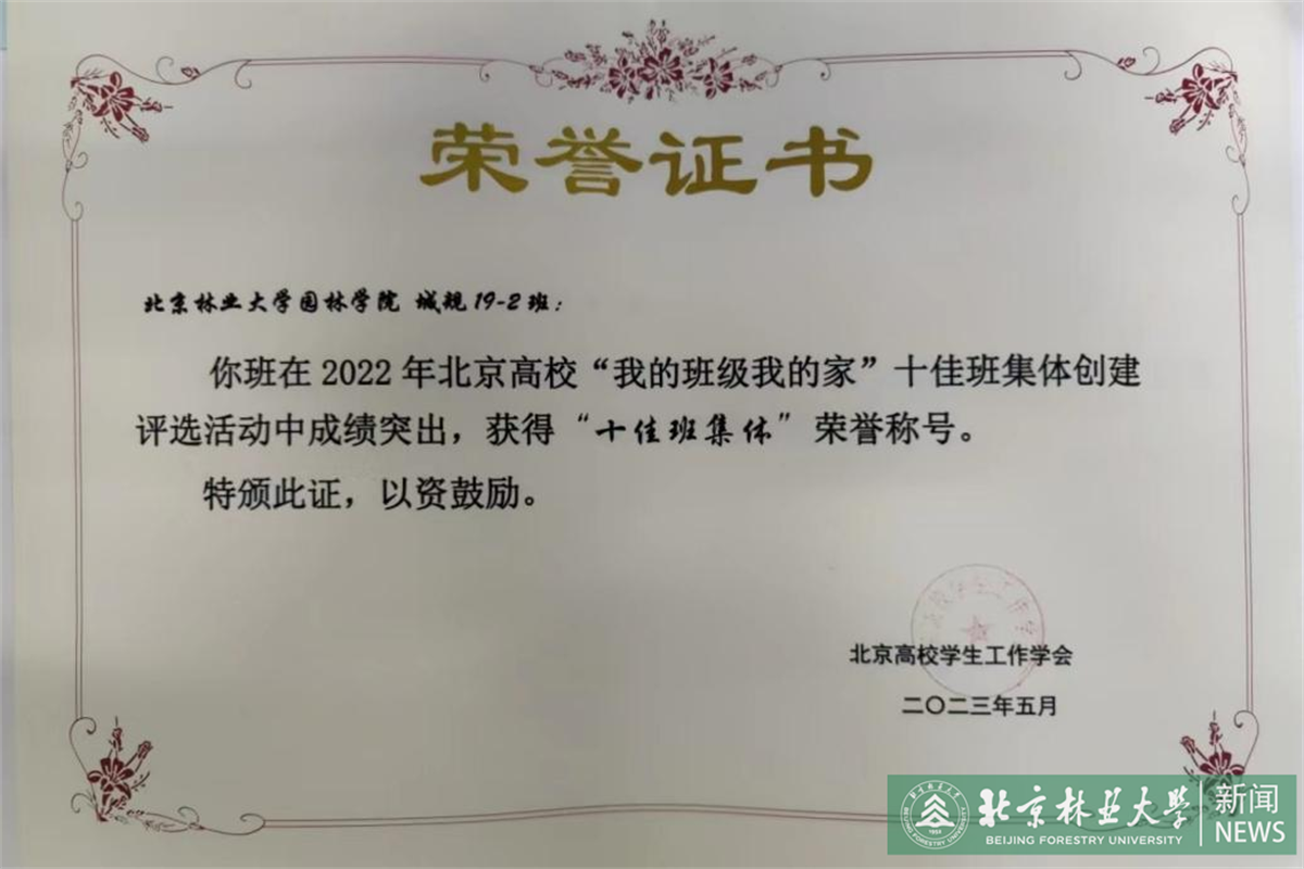 5月19日,2022年北京高校“我的班级我的家”十佳班集体创建评选活动在北京工业大学举行,我校园林学院城乡规划192班从来自全市53所高校的200余个基层班级中脱颖而出,荣获2022年北京高校“十佳班集体”荣誉称号。