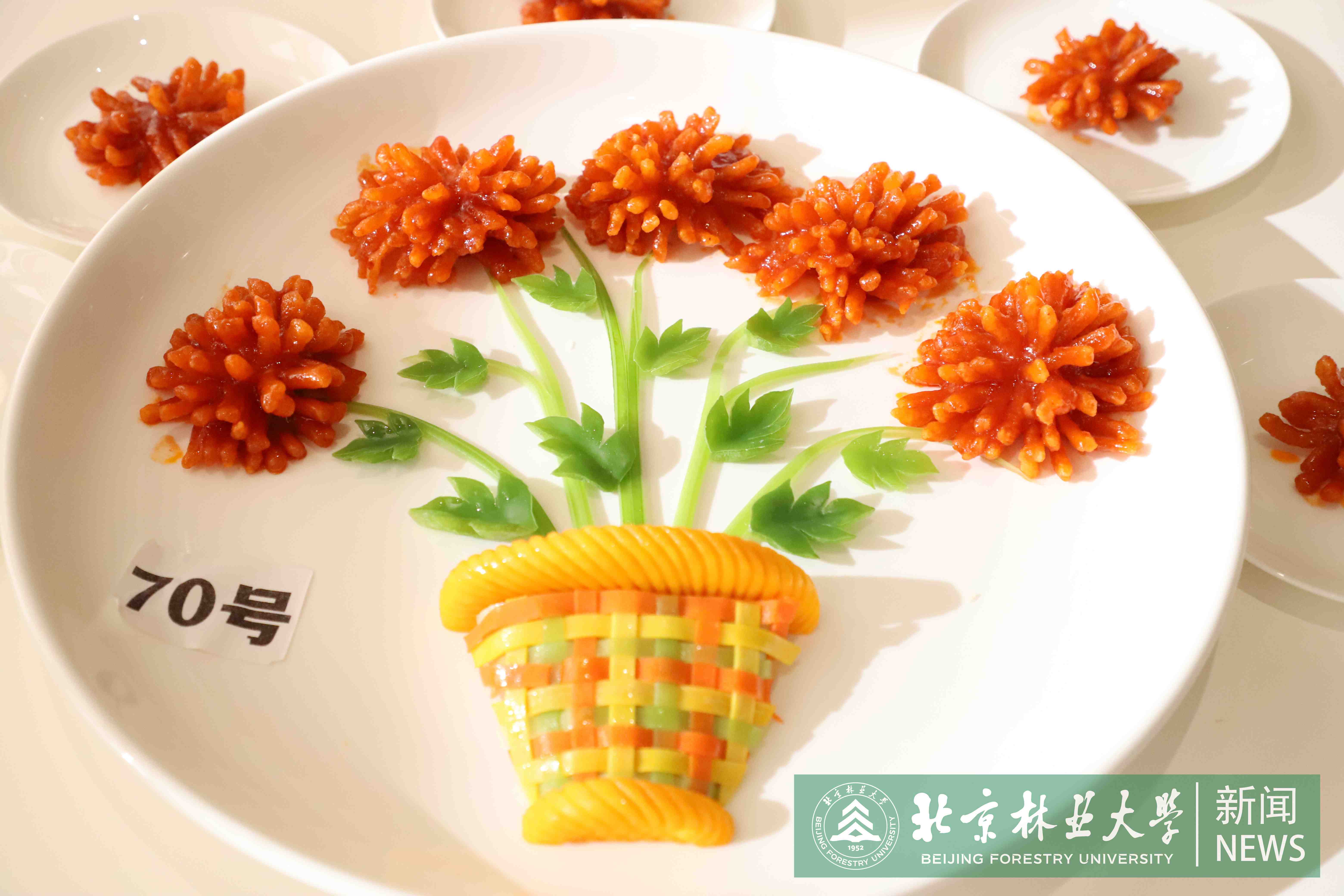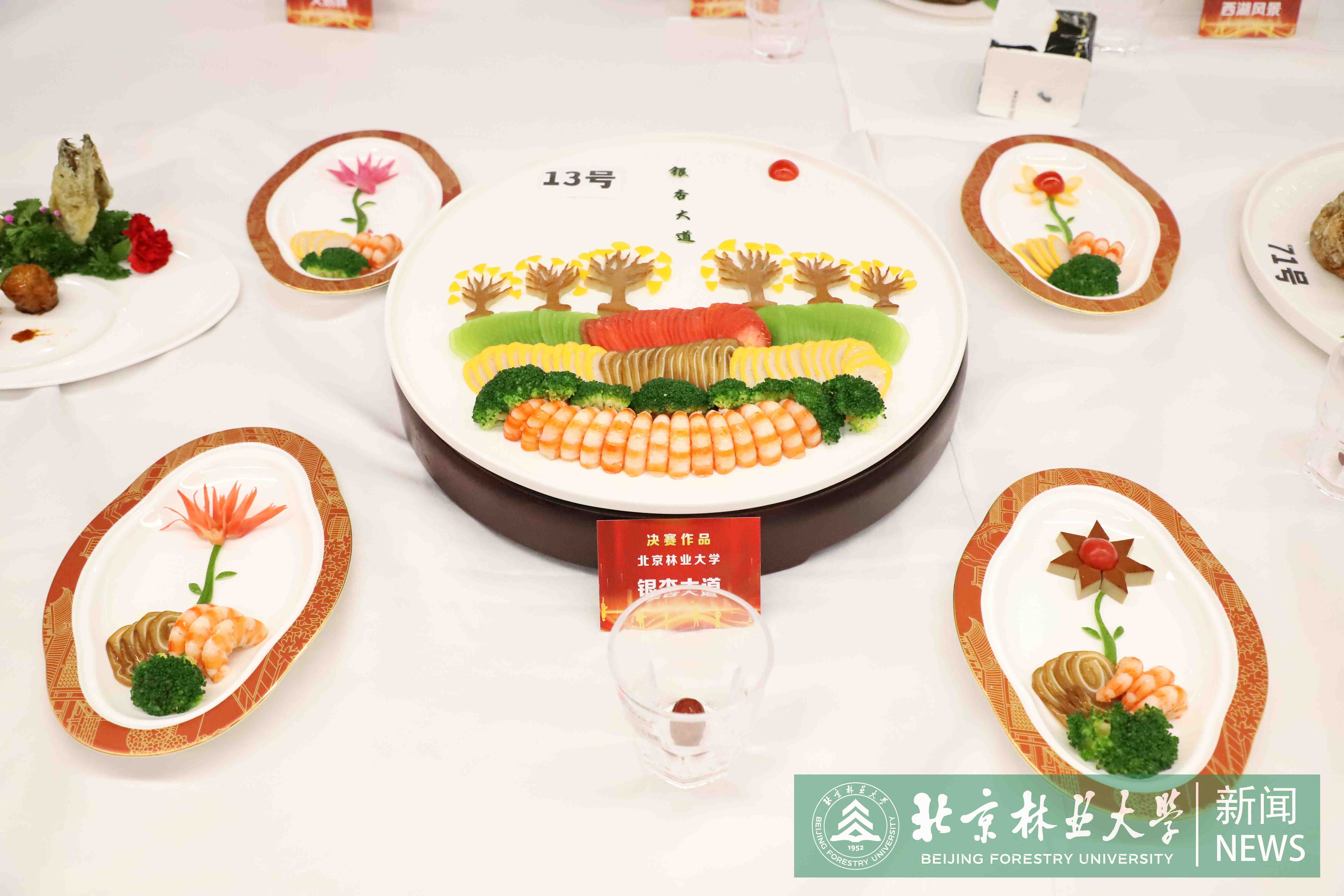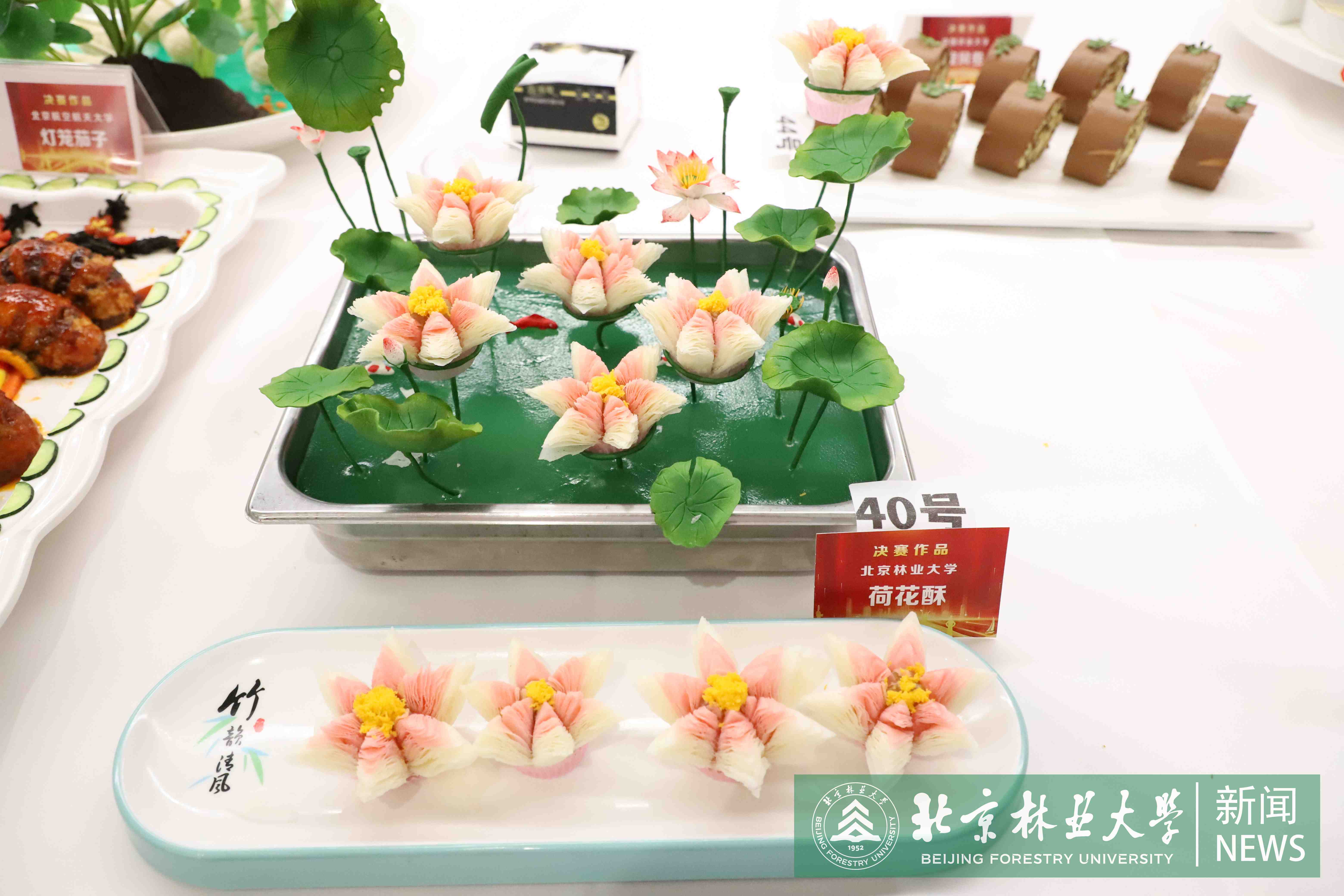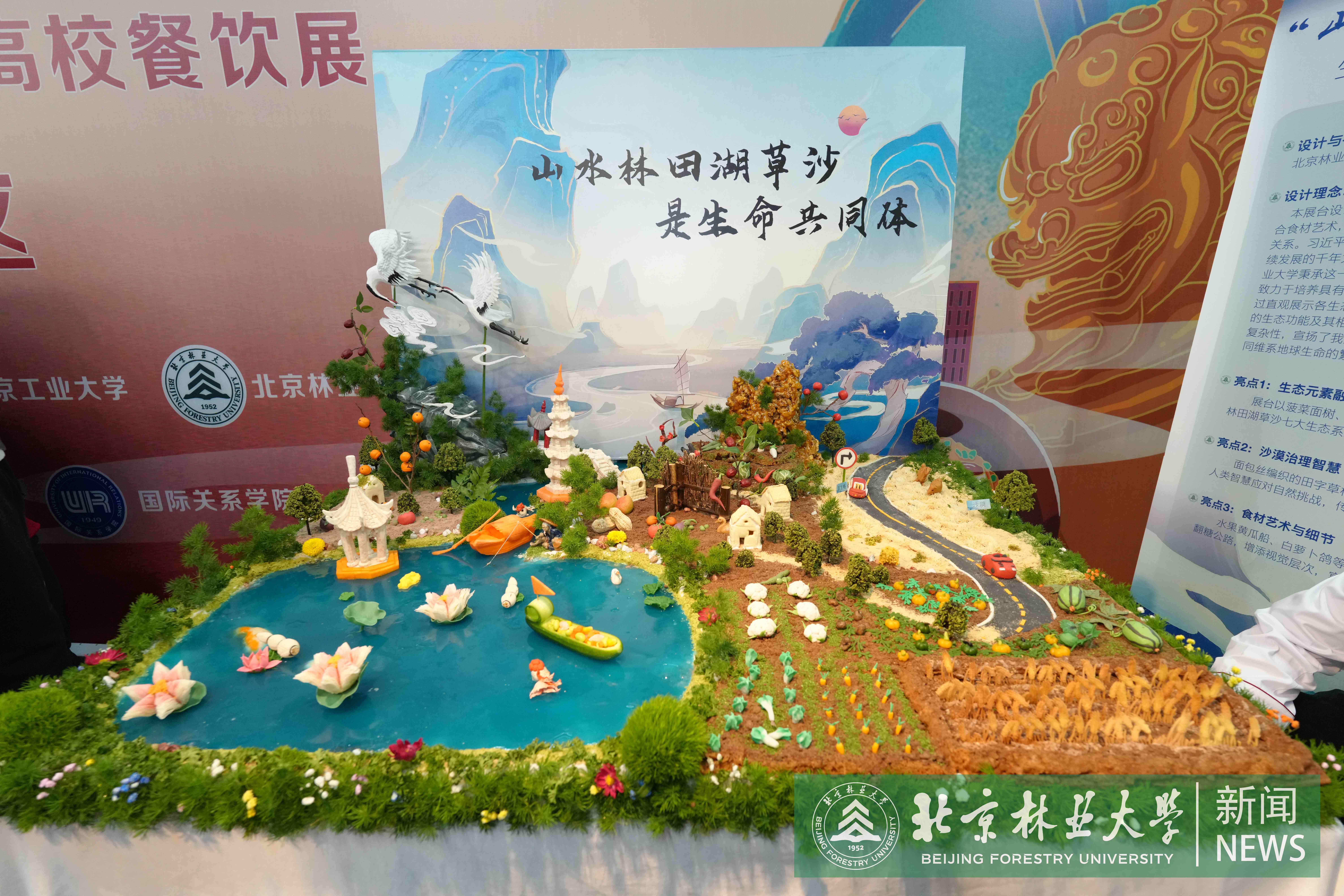 我校在本次烹饪技能大赛中派出3名参赛选手,杜忠师傅的红案作品《菊花里脊》、赵连红师傅的白案作品《荷花酥》以及张建锋师傅的冷拼作品《银杏大道》均荣获金勺奖,我校荣获团体一等奖,充分展现了我校餐饮团队的高超技艺和创意水平。在本次展会上,我校精心设计并布置了以“山水林田湖草沙”生命共同体为主题的展台作品,聚焦生态体系,突出生态元素与食材细节的巧妙融合,展现了食材取之于自然,人回馈自然的美学关系。