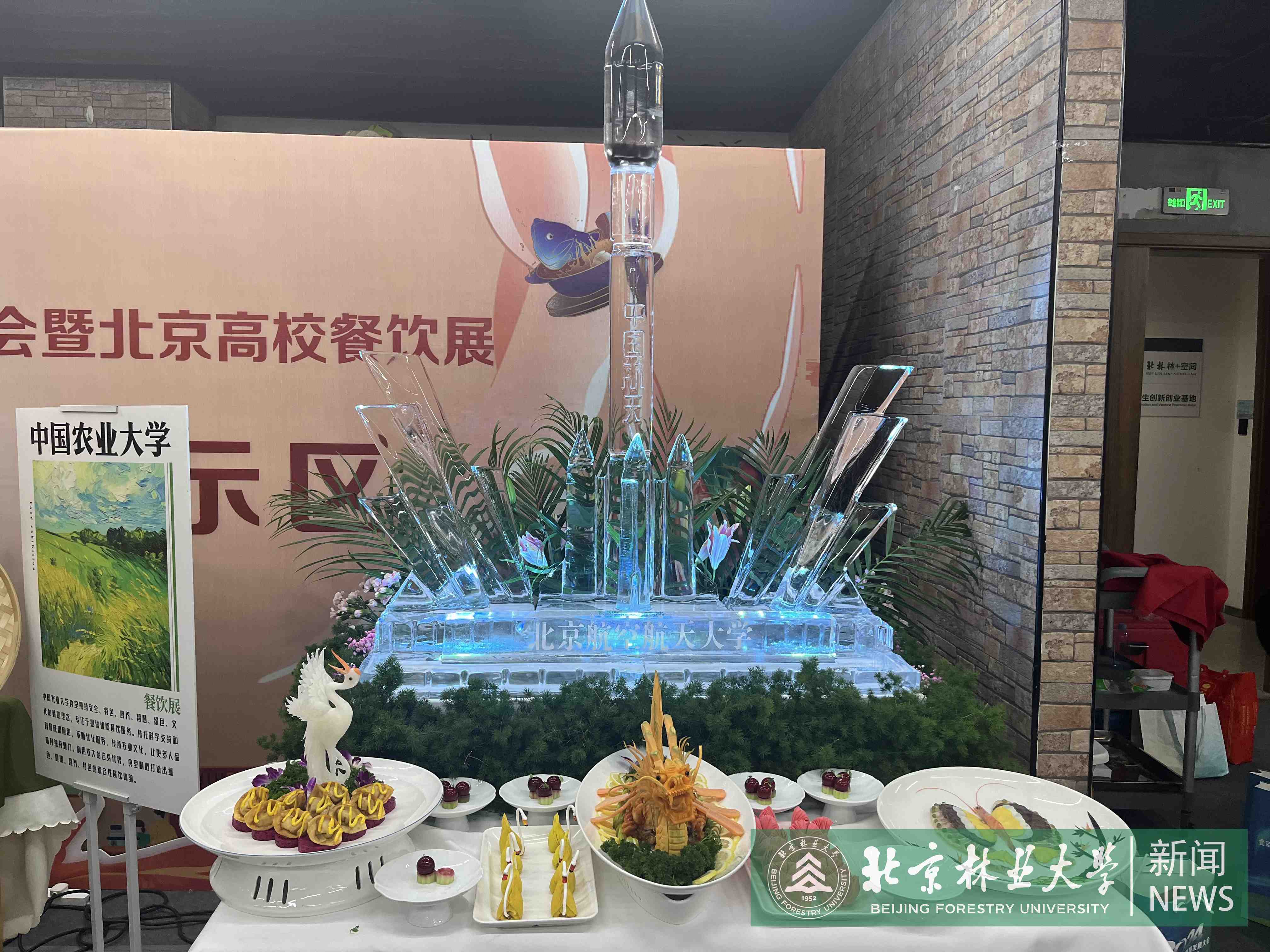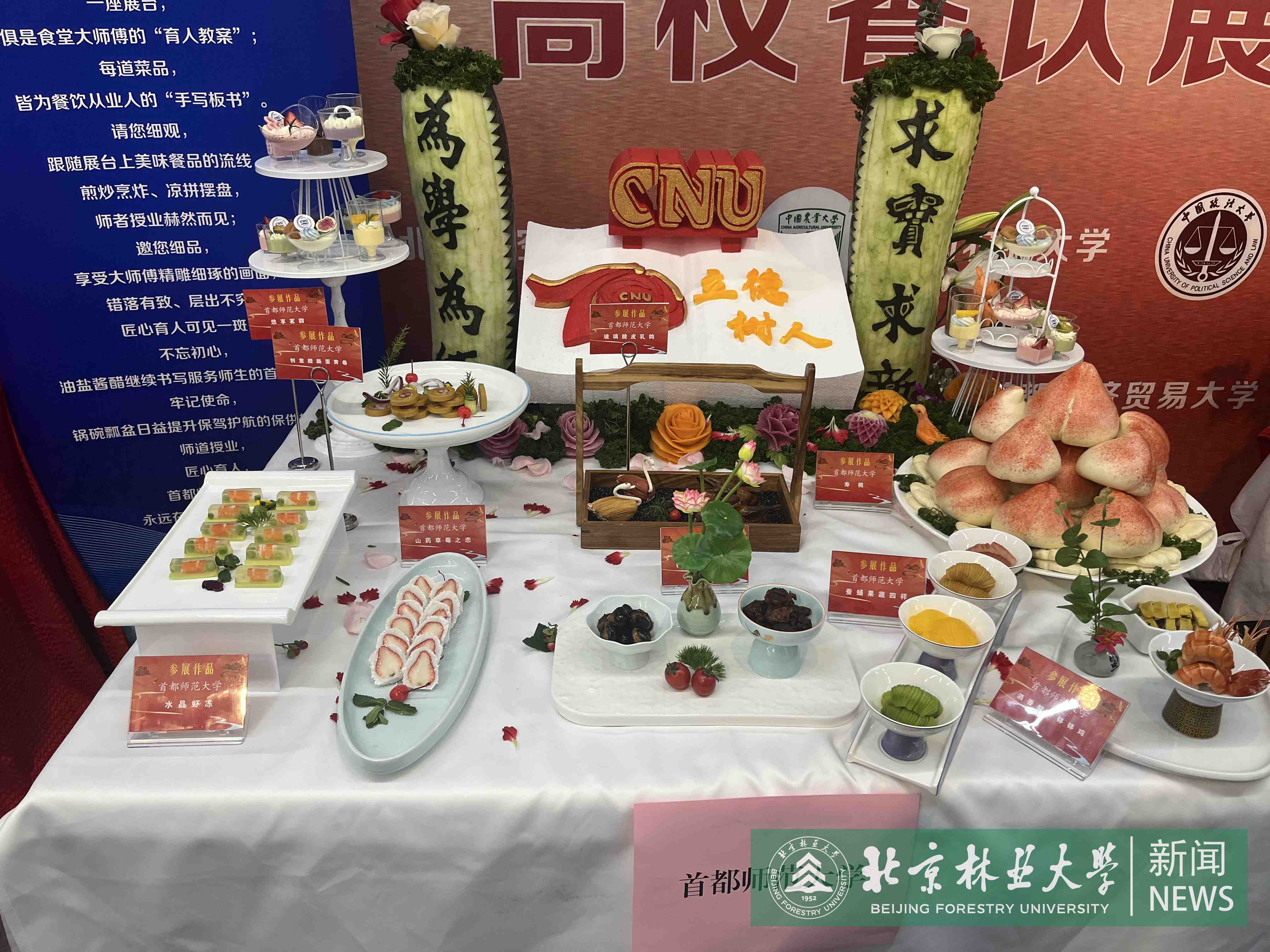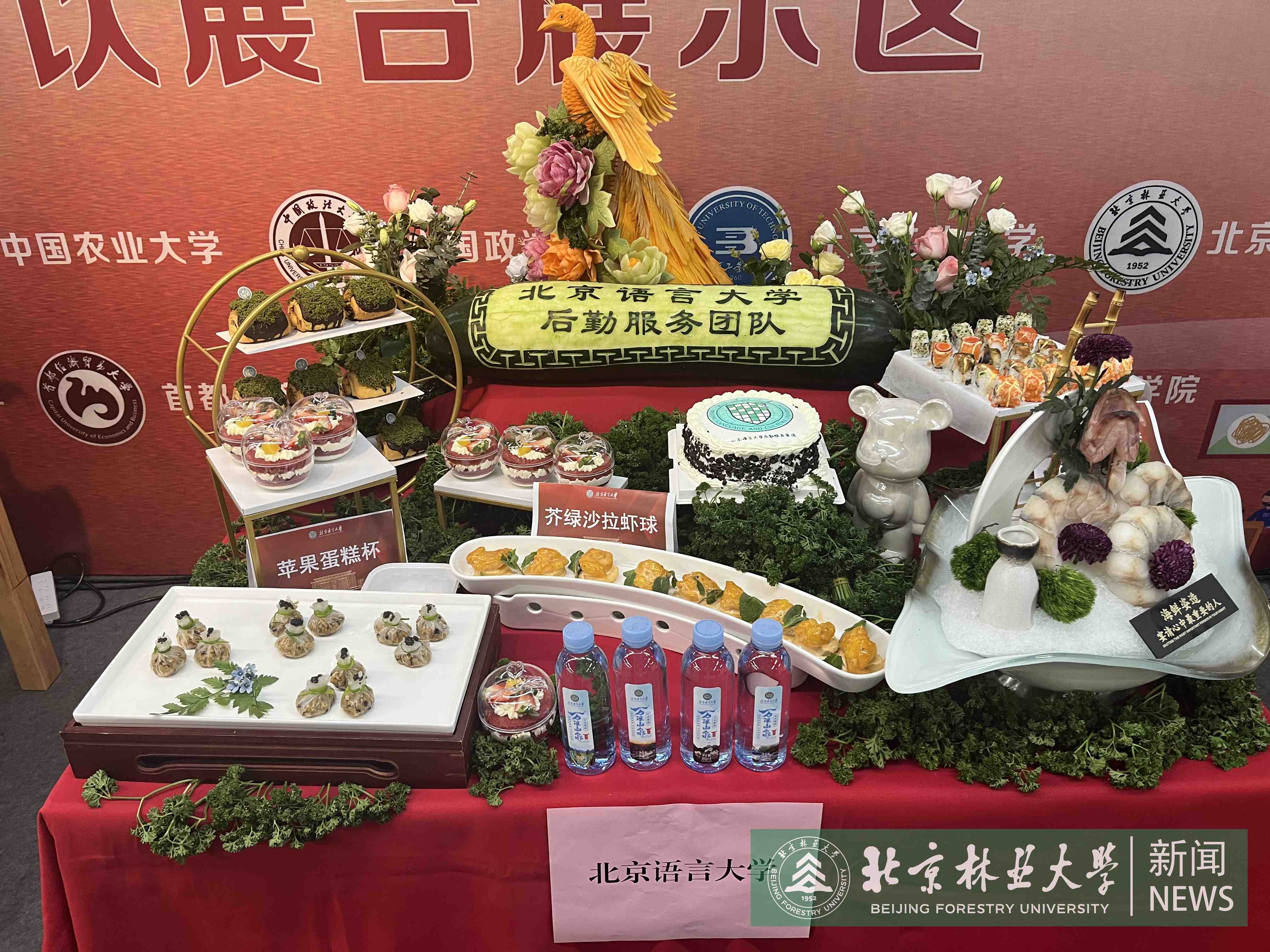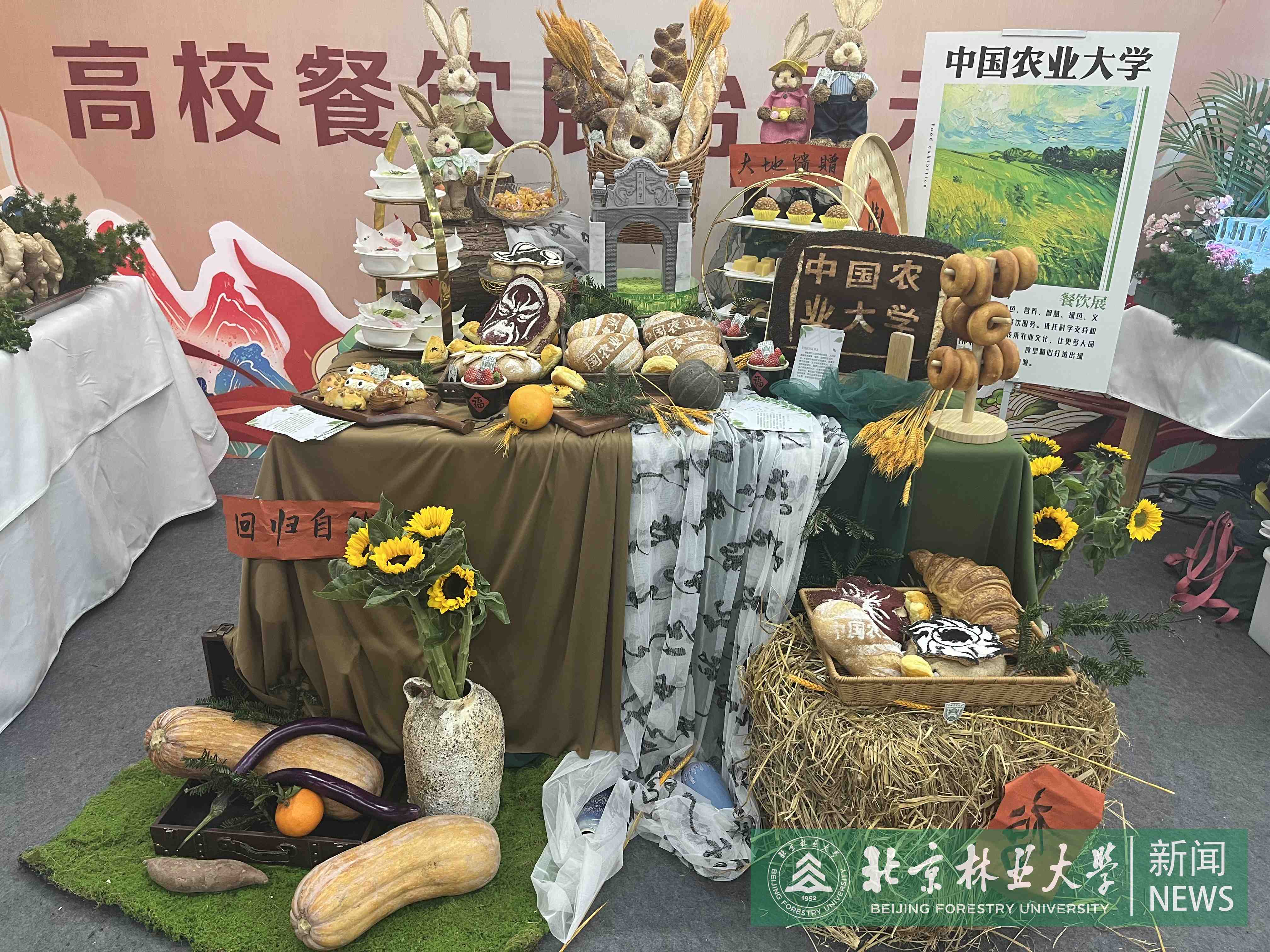 我校在本次烹饪技能大赛中派出3名参赛选手,杜忠师傅的红案作品《菊花里脊》、赵连红师傅的白案作品《荷花酥》以及张建锋师傅的冷拼作品《银杏大道》均荣获金勺奖,我校荣获团体一等奖,充分展现了我校餐饮团队的高超技艺和创意水平。在本次展会上,我校精心设计并布置了以“山水林田湖草沙”生命共同体为主题的展台作品,聚焦生态体系,突出生态元素与食材细节的巧妙融合,展现了食材取之于自然,人回馈自然的美学关系。