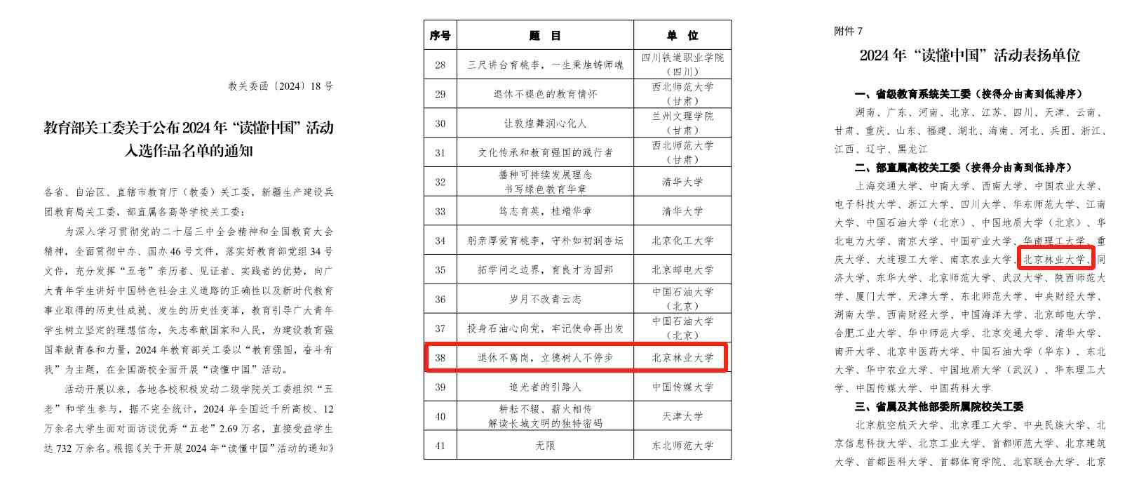近日,教育部关工委公布2024年“读懂中国”活动获奖作品名单。我校信息学院(人工智能学院)报送的《退休不离岗,立德树人不停步》(访王九丽教授)微视频作品入选2024年“读懂中国”活动优秀微视频。北京林业大学荣获2024年“读懂中国”活动表扬单位。