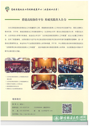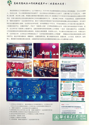 2019年1月,我校承建高校思想政治工作创新发展中心,承建方向为实践育人。校党委高度重视中心建设工作,校党委书记王洪元担任中心主任,亲自部署推动中心建设工作,指导制定中心建设方案,系统总结“时代新人铸魂工程”落地落实的实践探索和经验成效,撰文《小我融入大我 铸魂时代新人》在《中国高等教育》署名发表。组织开展实践育人领域前沿理论研究和实践创新,聚焦高校大学生思想入党问题,从理论和实践两个层面探索破解大学生思想入党密码的方法路径。主持《推动习近平新时代中国特色社会主义思想入脑入心长效工作机制的研究》全国党建研究会重点课题,推动出台《关于全面推动习近平新时代中国特色社会主义思想进教材进课堂进头脑的实施意见》,实施九个行动计划探索完善“三进”工作机制。主持《基于全程育人理念的课程思政体系建设研究与探索》北京高校思想政治工作重难点攻关计划项目。谋划部署“小我融入大我,青春献给祖国”主题社会实践,被列为2023年教育部“时代新人铸魂工程”十大行动之一。