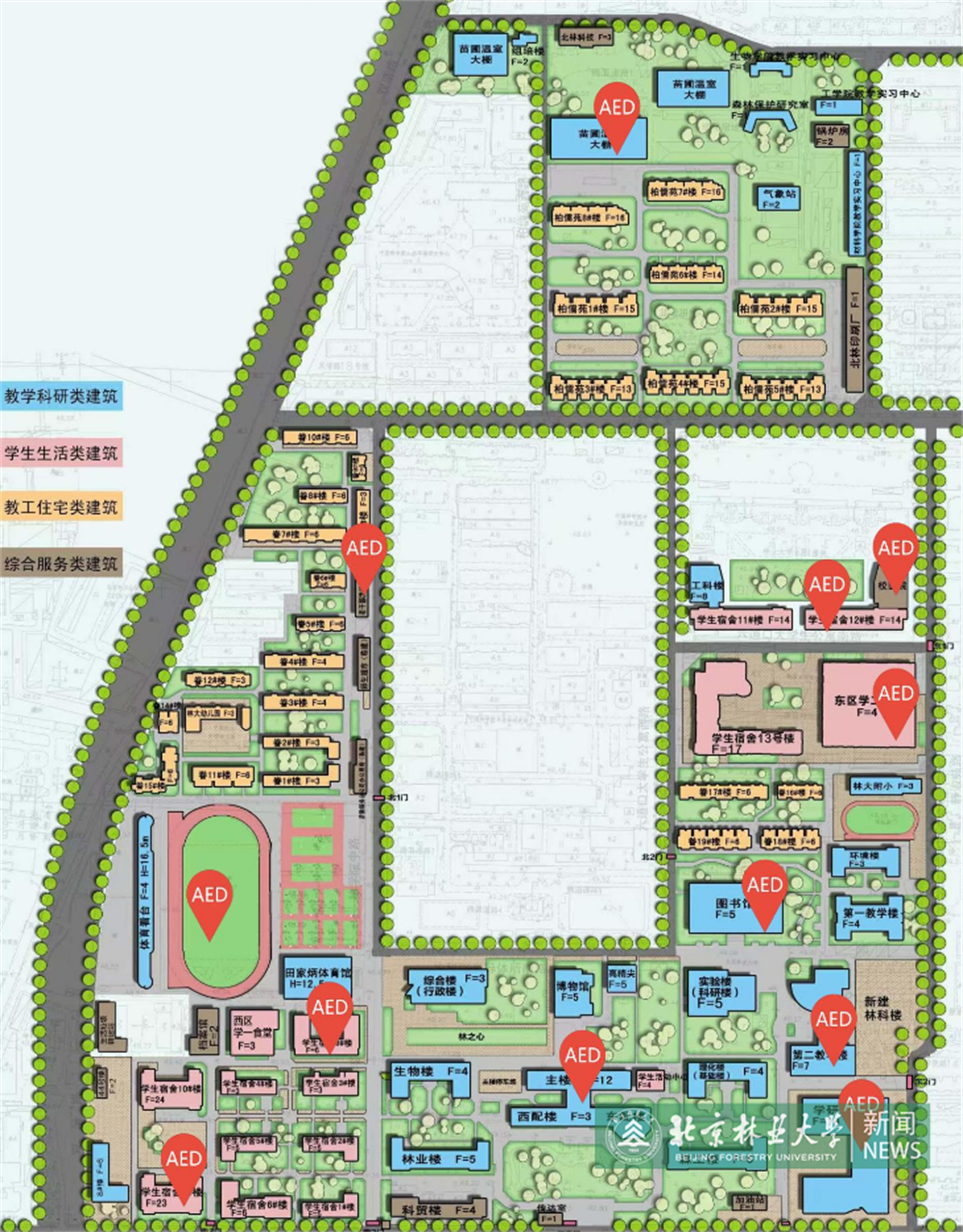在AED设备配置方面,我校科学布局急救设施,安装了12台自动体外除颤器(AED),覆盖教学楼、图书馆、体育场、宿舍区、家属区等人员密集场所,方便师生紧急使用。