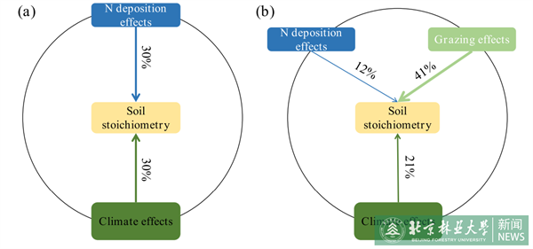 图2:未放牧草地(a)和放牧草地(b)土壤化学计量学的氮沉降效应贡献度分析(VPA)