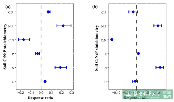 近日,我校草业与草原学院董世魁研究团队在青藏高原的高寒草甸和高寒草原两种草地类型的未放牧和放牧草地上进行了模拟氮沉降实验,同时设置对照和+N(8kgNha-1yr-1)处理。研究结果对氮沉降的影响效应进行了量化,发现氮沉降对未放牧和放牧草地的土壤C:N:P的影响存在差异。未放牧草地的土壤C:N:P受到氮沉降的影响较为显著,而放牧草地仅有土壤氮、磷含量以及土壤碳氮比和氮磷比受到氮沉降的显著影响(图1)。在放牧草地,氮沉降的影响效应从未放牧草地的30%显著降低到12%(图2),这表明放牧可能会在一定程度上削弱氮沉降对土壤C:N:P的影响。此外,其他气候和环境因素如温度、降水和草地类型也可以在一定程度上调节氮沉降对草地土壤C:N:P的影响。