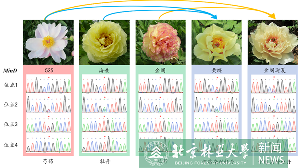 课题组还利用了两对亲本和子代已知的伊藤牡丹杂交组合,对亲本和子代各品种中的四个基因进行了测序分析(图3),结果和上述结果一致。