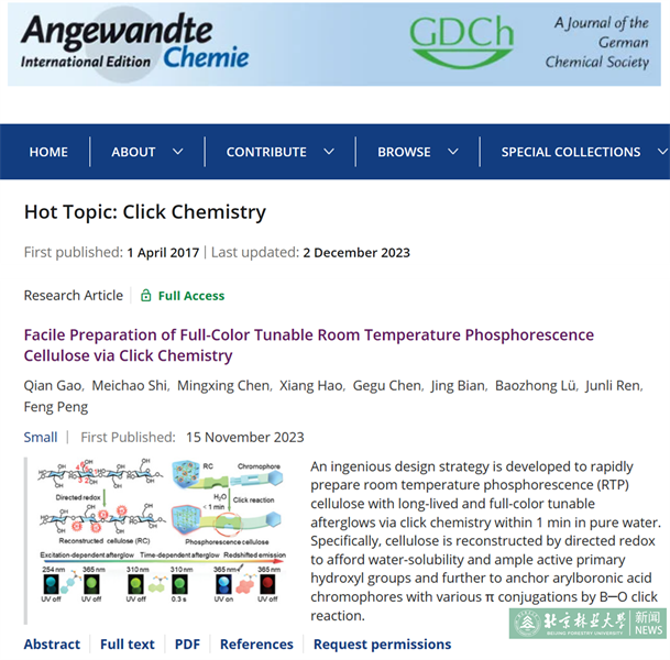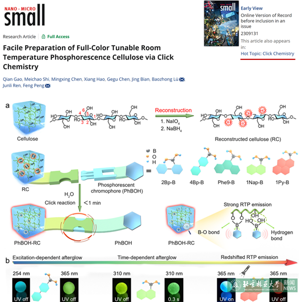 近日,材料科学与技术学院彭锋教授课题组在纤维素基室温磷光(RTP)材料研究领域取得新进展,研究论文以“Facile preparation of full-color tunable room temperature phosphorescence cellulose via click chemistry”为题发表于材料领域一区Top期刊《Small》(IF="13.3),并入选《Angew. Chem. Int. Ed.》最新一期的点击化学热点话题文章(Hot Topic: Click Chemistry)。