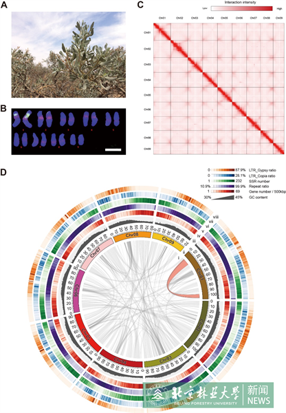 (A) 野外生长的蒙古沙冬青植株(图片采集于内蒙古阿拉善左旗,2015年7月);(B) 蒙古沙冬青的染色体核型分析;(C) 使用Hi-C三维基因组信息组装的9条沙冬青染色体;(D) 基因组的注释和基因组内部的共线性关系。