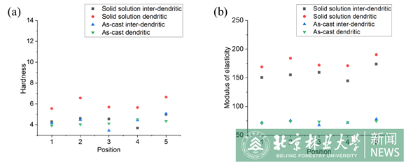 镍基单晶高温合金以其卓越的高温强度、结构稳定性、使用可靠性以及高温蠕变性能,在航空航天、船舶及特种制造业等领域得到了广泛应用。但由于不同元素的溶解度不同,导致在定向凝固过程中极易发生元素偏聚现象,从而对合金的微观力学性能甚至是宏观力学性能造成不利影响。本文将纳米压痕与元素分布相结合,分析了γ/γ'两相及枝晶组织元素分布,如图1和图2所示,结果表明,Al和Co元素偏析系数变化最大,枝晶间中Al元素偏析系数下降了36%,Co元素偏析系数上升了19%;枝晶干Al元素偏析系数下降了29%,Co元素偏析系数上升了34%。同时对固溶处理前后枝晶间和枝晶干组织分别进行了纳米压痕实验,结果如图3所示。结果表明,枝晶间弹性模量由72.990 Gpa提升至156.727 Gpa,提升了114.7%,枝晶干弹性模量由73.091 Gpa提升至177.408 Gpa,提升了142.7%。枝晶间硬度无明显变化,而枝晶干硬度由4.188 Gpa提升至6.025 Gpa,提升了43.86%。
