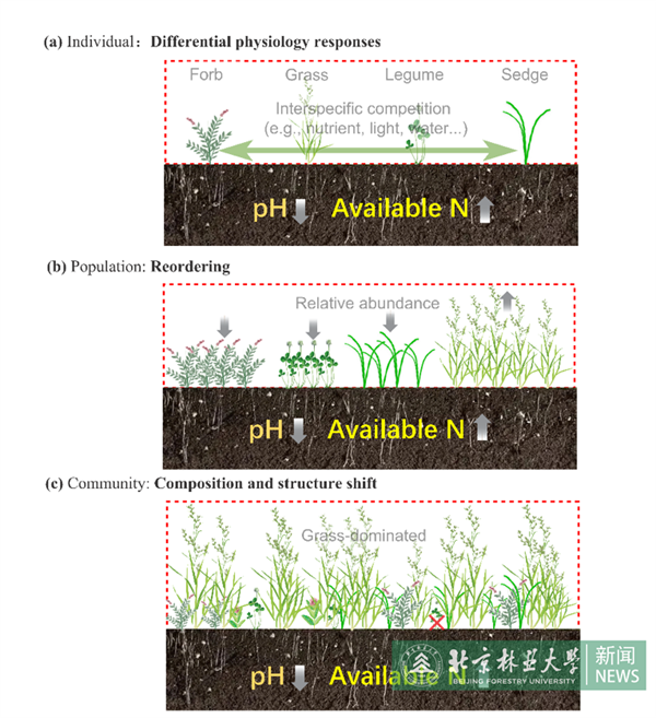 注:红色箭头代表竞争关系,红色×表示物种消失,大小代表物种的优势度。不同功能类群植物个体光合生理对氮沉降的加剧产生差异性响应(a),这种差异性响应继而在功能群水平上引起物种的重排序(b),这种排序导致了竞争力强的功能群植物利用有限资源快速生长迅速完成扩张,草地植物群落结构和组成的改变,最终造成群落演替(c)。