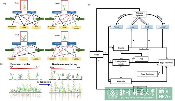 图2 路径分析。(a) 结构方程模型中,黑色箭头表示正效应,红色箭头表示负效应。箭头的宽度表示效应的强度。数字表示显著通路的标准化路径系数。(b) 氮添加导致功能群重排序。(c) 氮添加、气候因素、植物生理指标之间关系的概念模型。+表示正效应,-表示负效应。