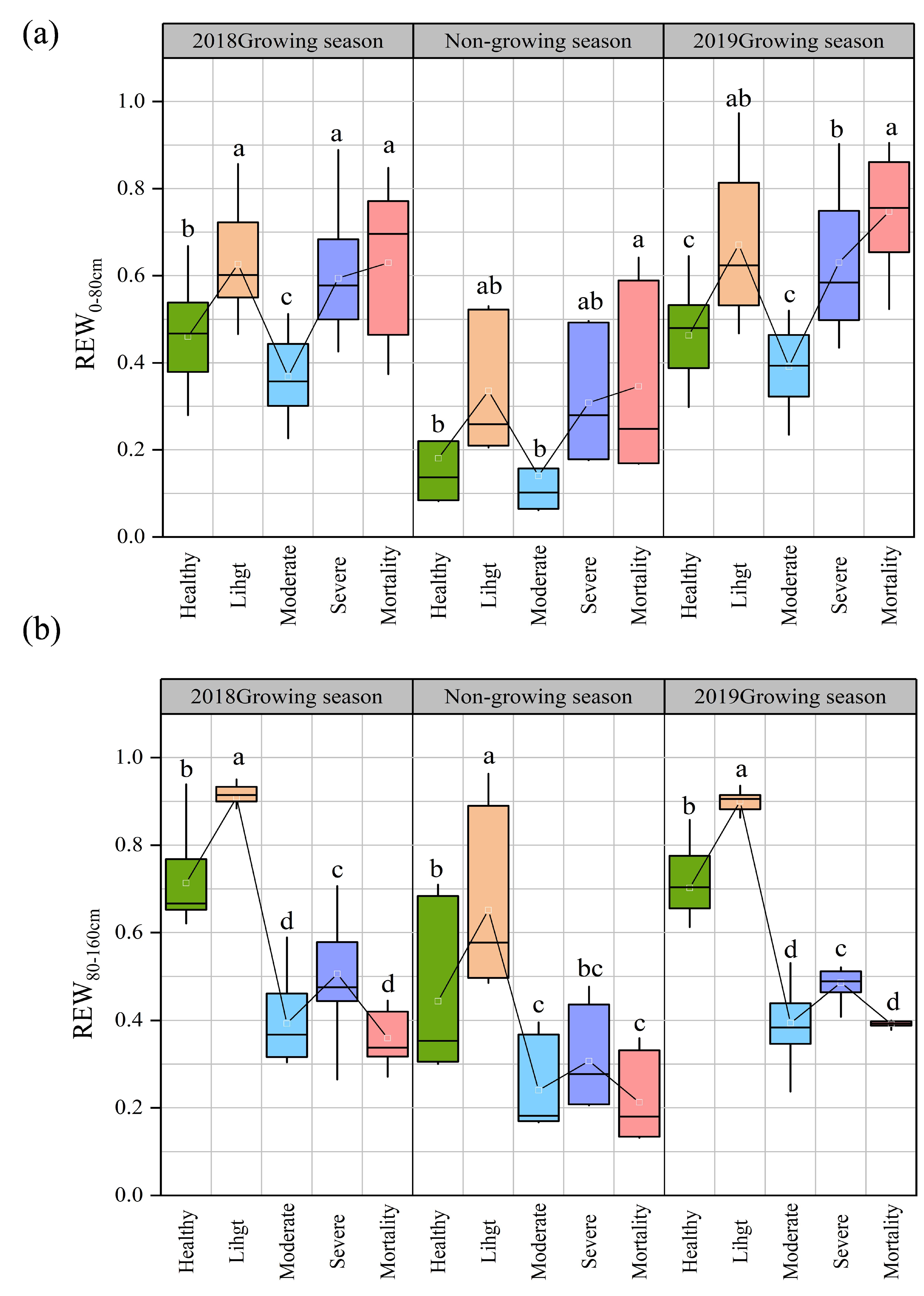 深层土壤水分受土壤性质影响,土壤砂粒含量越高、容重越大,土壤水分条件越差,小叶杨退化程度也越严重。因立地条件不佳,小叶杨对干旱灾害抵抗力差,导致在干旱期间发生退化、甚至死亡现象。退化小叶杨非生长季深层土壤相对有效含水率远低于土壤水分亏缺阈值。