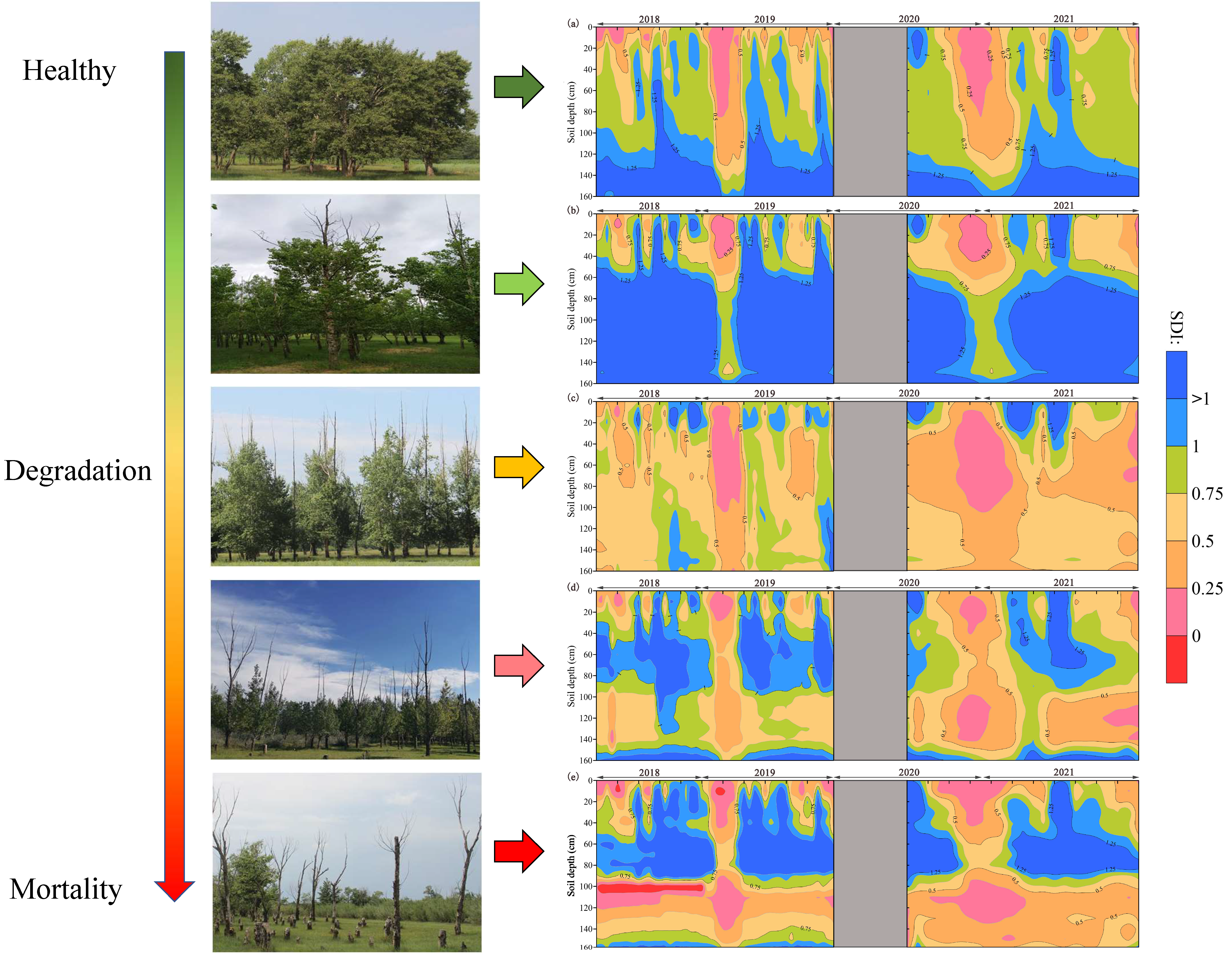 近年来,土壤水分亏缺导致三北防护林衰退死亡问题受到广泛关注,但防护林退化与土壤水分动态的相互作用机制尚不清楚。小叶杨是三北防护林工程常用树种之一,确定小叶杨退化与土壤水分之间的响应关系对于三北防护林建设管理具有重要意义。