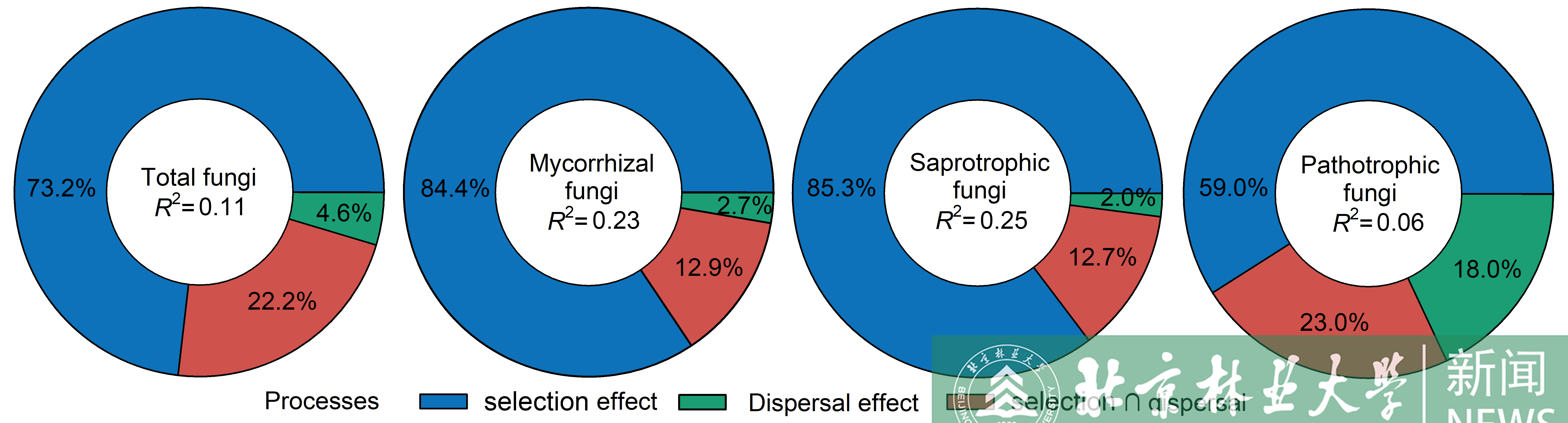 课题组还从地下维度厘清植物功能性状对土壤真菌功能群构建的影响,发现真菌群落及其功能群的构建过程由确定性过程(异质性选择)驱动,植物根系性状是介导真菌群落构建的主要因素。