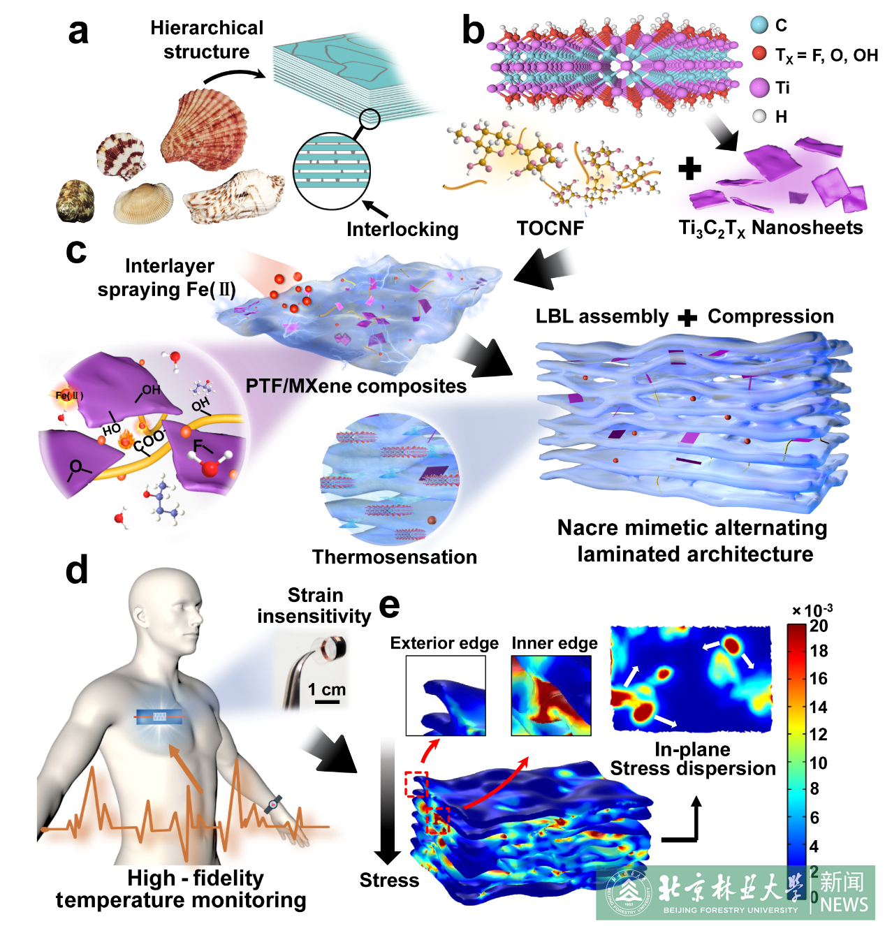 近日,我校材料学院研究团队受贝壳材料异质结构和层间高强度矿物桥协同增韧机制的启发,创新性地提出金属配位层间交联方法,解决了柔性热敏弹性体在可穿戴应用方面的关键科学问题,展示了纳米纤维素在不同维度结构复合材料制备上的范例,实现了在多个场景中无信号失真的可穿戴热敏弹性体温度检测。