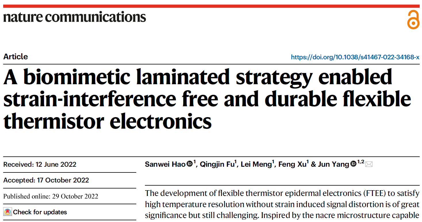 相关研究成果以《一种仿生层压策略实现无形变干扰且耐用的柔性热敏电阻电子器件》(A Biomimetic Laminated Strategy Enabled Strain-interference Free and Durable Flexible Thermistor Electronics)发表在《自然·通讯》(Nature Communications)上,材料学院博士研究生郝三伟为论文第一作者,杨俊副教授为通讯作者,许凤教授提供了重要支持。该研究获得国家自然科学基金和中央高校基本科研业务费专项资金的资助。