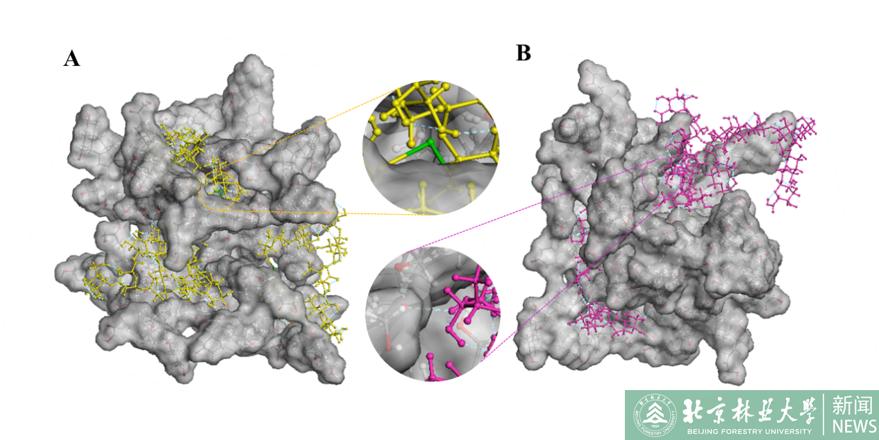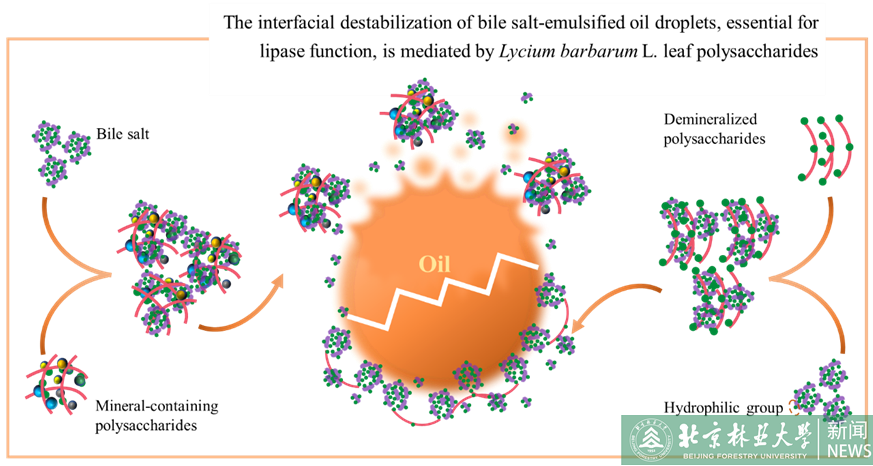 研究发现,枸杞叶多糖可以强烈破坏胆酸盐稳定的乳液,是抑制游离脂肪酸释放的主要原因。进一步研究发现,枸杞叶多糖中的矿质元素对于多糖与胆盐的结合有重要影响,多糖对乳液稳定性的作用主要是由于多糖中的内源性矿物质(28%)影响了胆酸盐与多糖复合物的聚集和两亲性。动力学模拟结果表明,胆酸盐与含矿物质的多糖的相互作用占据了胆酸盐中的疏水位点,提高了复合物的亲水性,这是导致结合物乳化能力降低的根本原因。这些发现从界面化学的角度为植物源多糖对脂肪消化的影响提供了新的见解,也进一步加深了我们对多糖与肠道分泌的脂质消化物相互作用的理解。