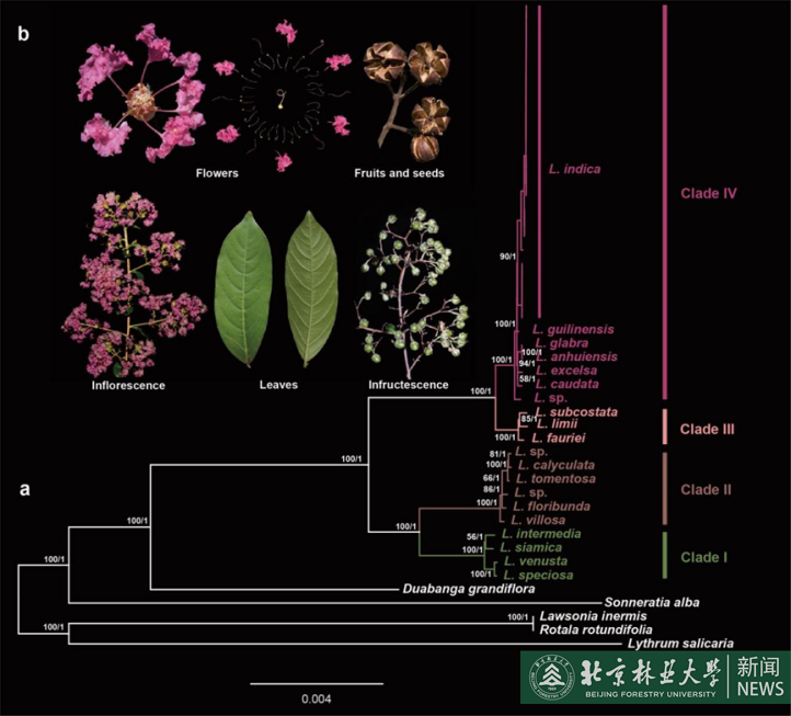 该研究对紫薇栽培品种进行系统取样,选取代表不同的变异类型和花形态特征的多个品种材料,利用质体基因组和细胞核核糖体DNA数据揭示栽培品种间的遗传变异,同时整合紫薇属其他野生物种的数据构建紫薇属的系统发生关系揭示栽培紫薇品种的母本起源。本研究对紫薇品种的栽培历史和品种选育的过程提供了新的认识。同时,结果表明质体基因组数据和细胞核核糖体DNA的数据表现出较高的遗传变异性,未来可应用于物种内/群体间水平尺度上的研究。