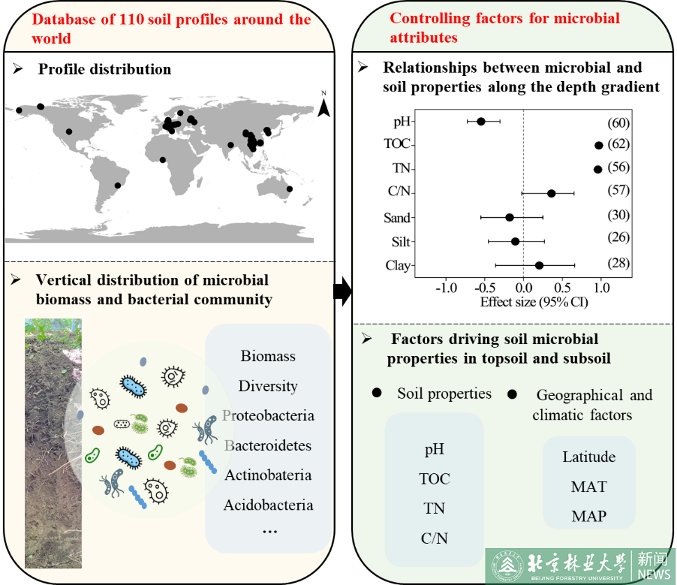 近日,林学院森林土壤学团队基于全球110个土壤剖面数据的研究揭示了微生物生物量和细菌群落随土壤深度的垂直分布特征,并阐明了微生物生物量和多样性的全球分布格局的驱动因素,研究成果发表在Science of The Total Environment(一区,IF=10.753)上,论文题为The vertical distribution and control factor of microbial biomass and bacterial community at macroecological scales,博士生何丽兵为第一作者,孙向阳教授为通讯作者,北京林业大学为文章唯一完成单位。