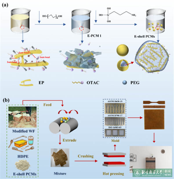 近日,材料学院科研团队提出了一种通过阳离子交换和层层自组装构建有机网络结构的新策略,设计制备了具有薄壁膨胀珍珠岩壳层、相变材料吸附量高的核壳结构定形相变储热材料(E-shell PCM)。独特的保护壳使相变储热材料具有较高的潜热(136.40 J/g)和良好的结构稳定性。以木塑复合材料为基质,E-shell PCM为储热功能单元,制备的木塑生态相变储热复合材料具有良好的形态稳定性、机械强度和储热性能,熔融和结晶热分别达到76.06J/g和74.61J/g。同时,膨胀珍珠岩的引入提高了复合材料的导热和抑烟阻燃能力。
