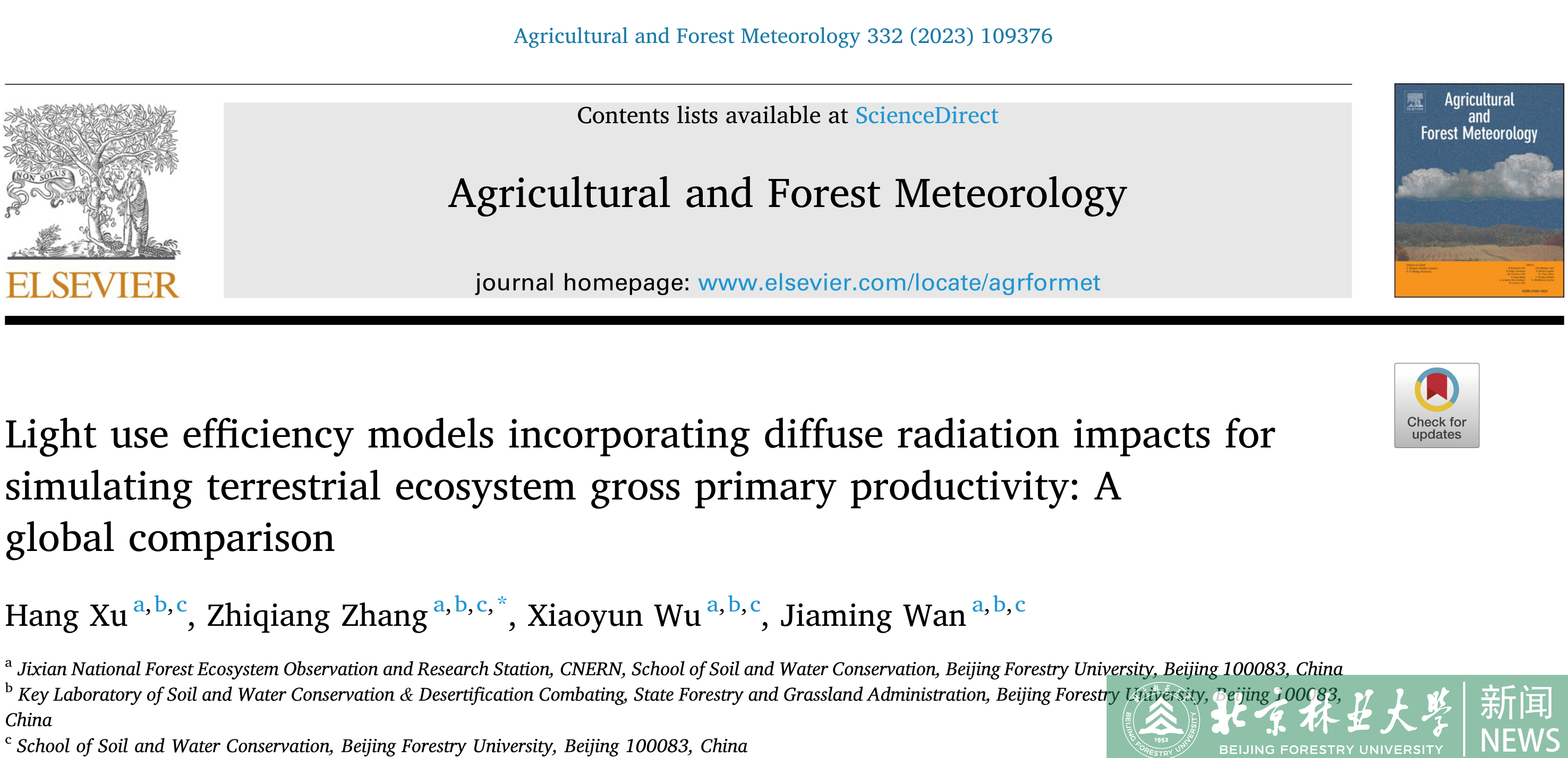 近日,农林科学领域顶级期刊Agricultural and Forest Meteorology在线发表了我校水保学院张志强教授团队学术论文“Light use efficiency models incorporating diffuse radiation impacts for simulating terrestrial ecosystem gross primary productivity: A global comparison”,水保学院青年教师许行博士为该论文第一作者,张志强教授为通讯作者。