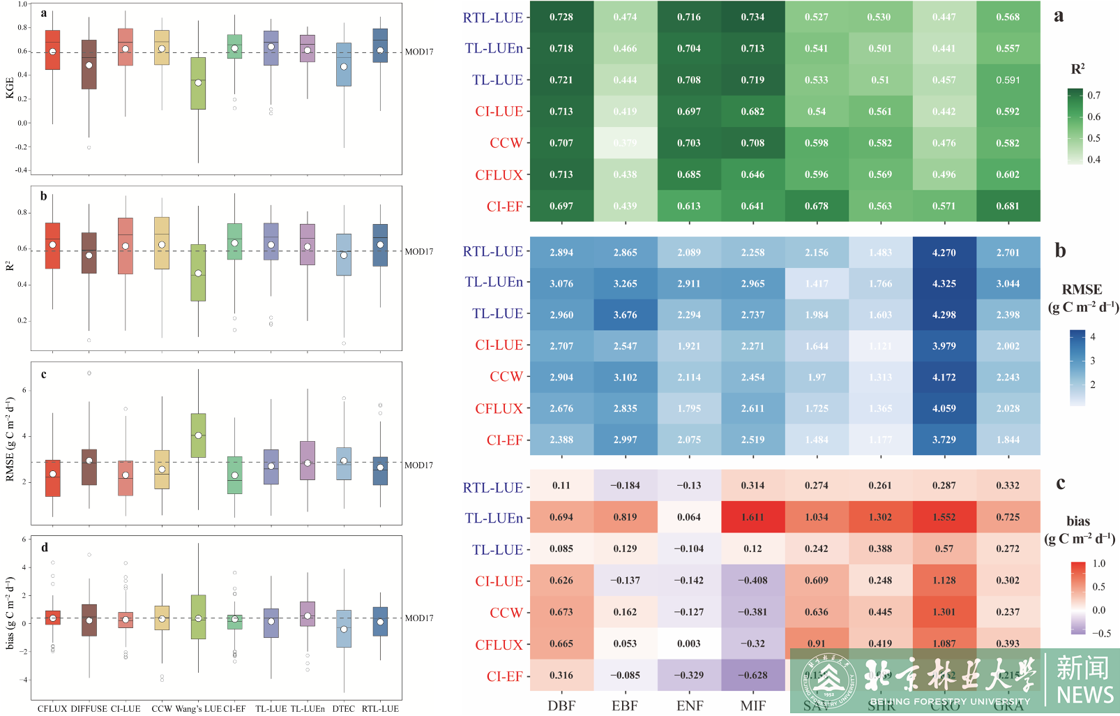 针对上述问题,研究团队利用全球102个陆地生态系统和950个站点年的碳通量、气象、植被等多源数据,对目前广泛使用的十个LUE模型(CFLUX、DIFFUSE、CI-LUE、Wang's Model、CI-EF、TL-LUE、TL-LUEn、DTEC和RTL-LUE)的模拟结果进行了全球评估。
