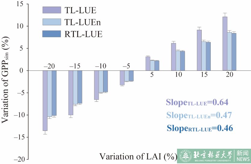“双叶”模型模拟的GPP对叶面积指数(LAI)的敏感性