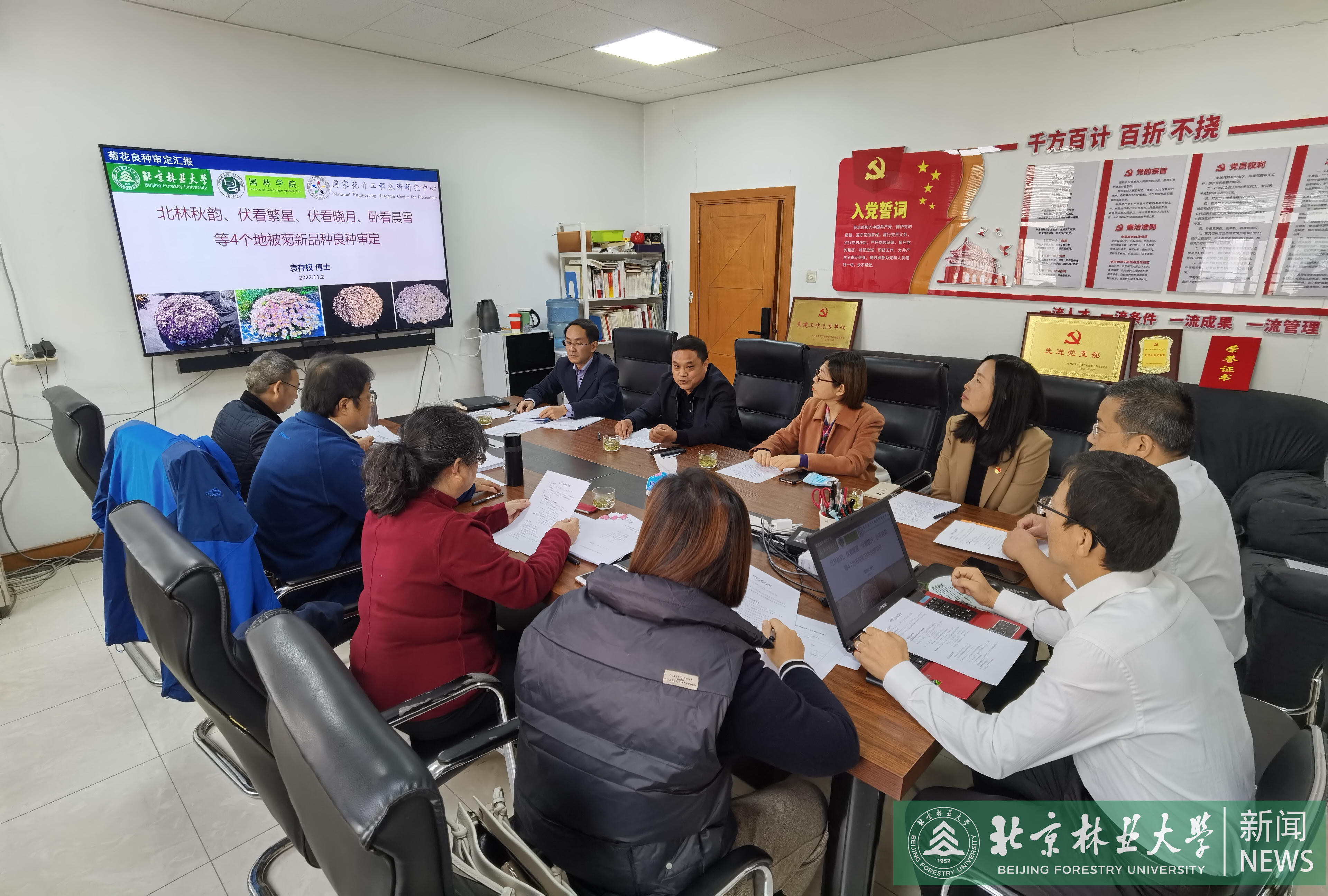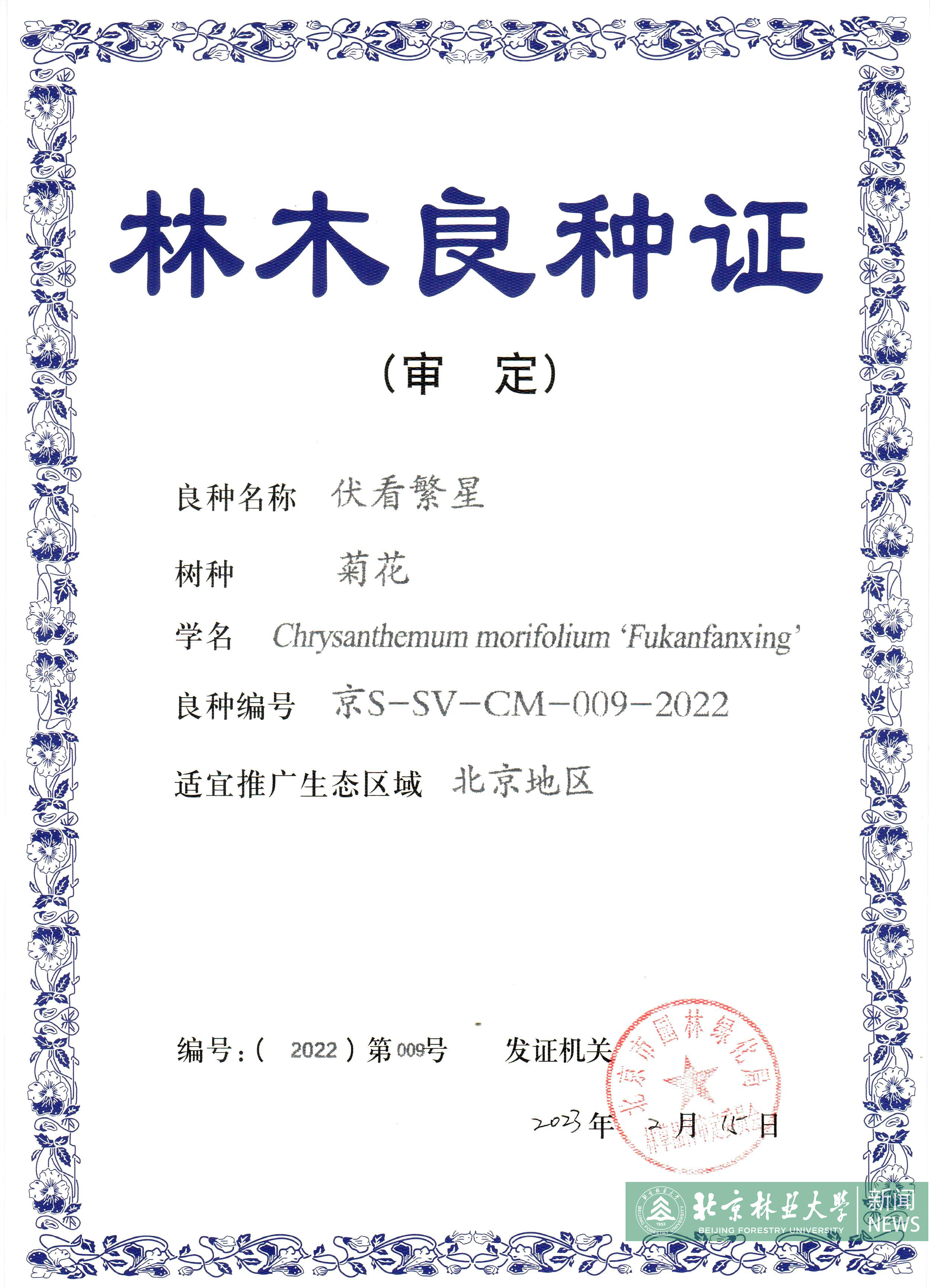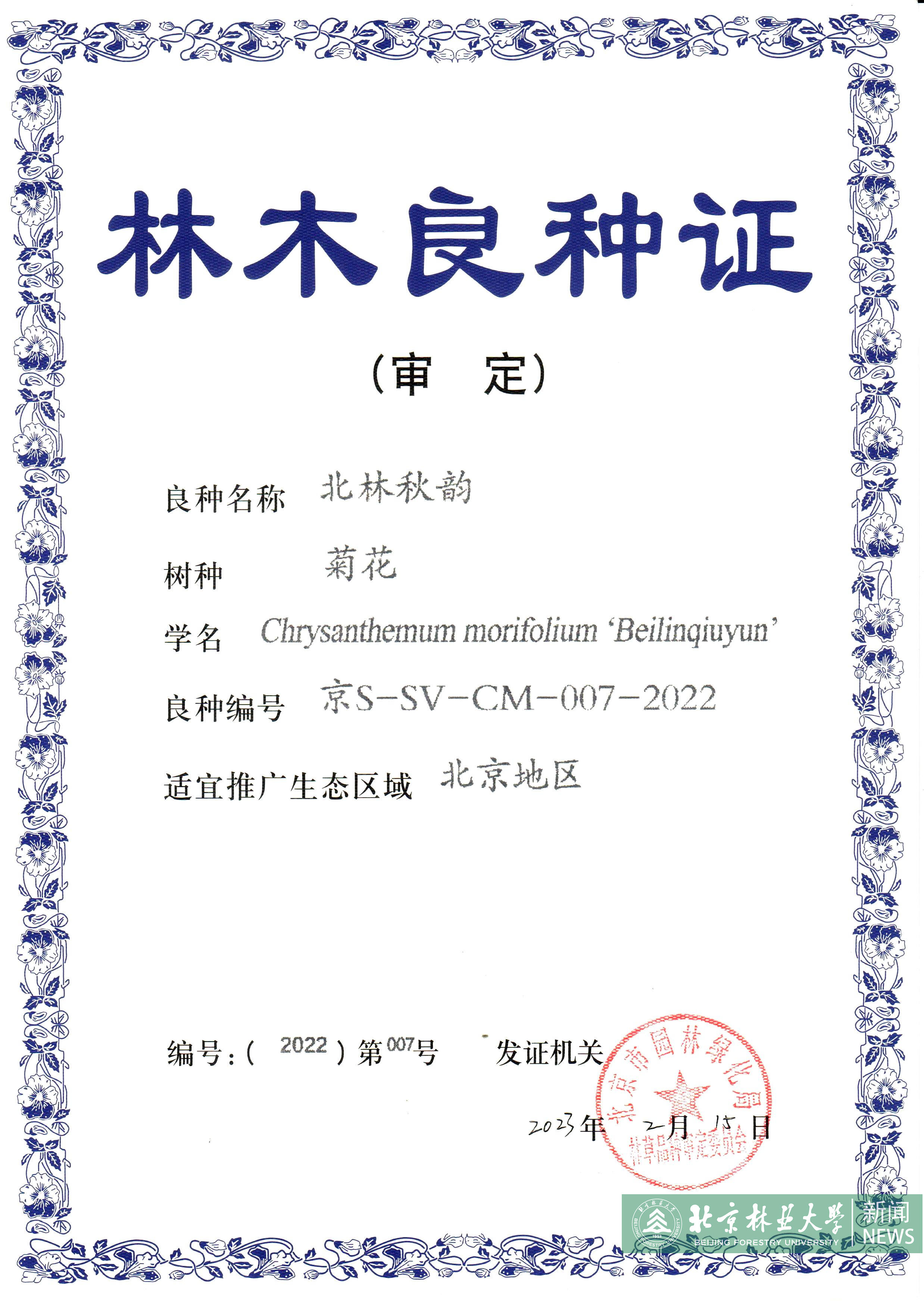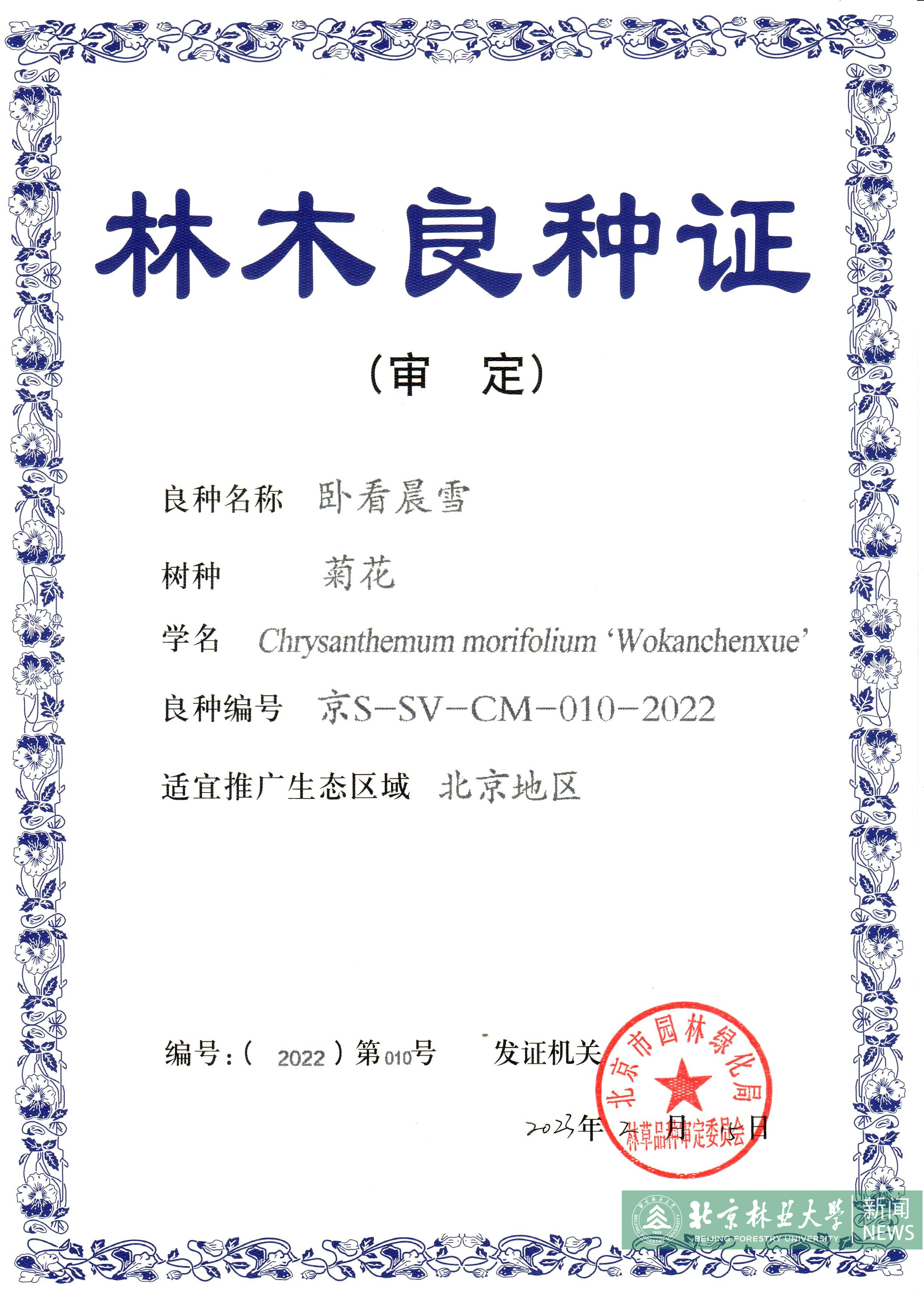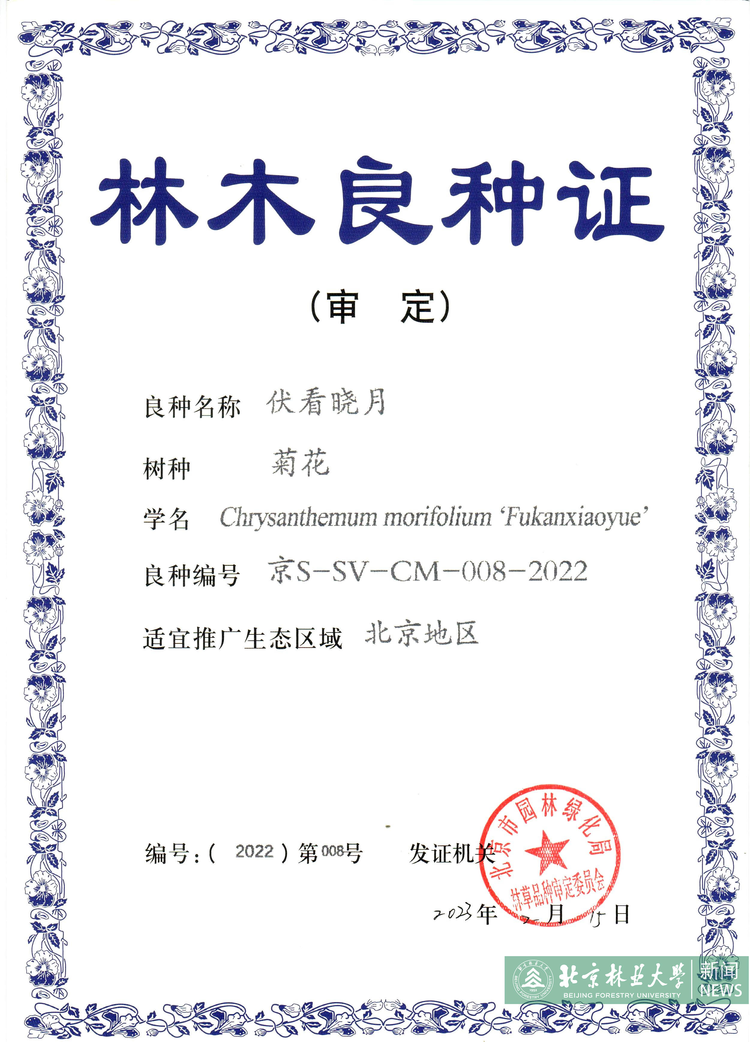 近日,我校花卉中心张启翔教授菊花育种团队培育的“伏看晓月”“卧看晨雪”“伏看繁星”“北林秋韵”4个低矮匍匐型和株型紧凑型菊花新品种通过北京市林木品种审定委员会审定,获得“北京市林木良种证书”。