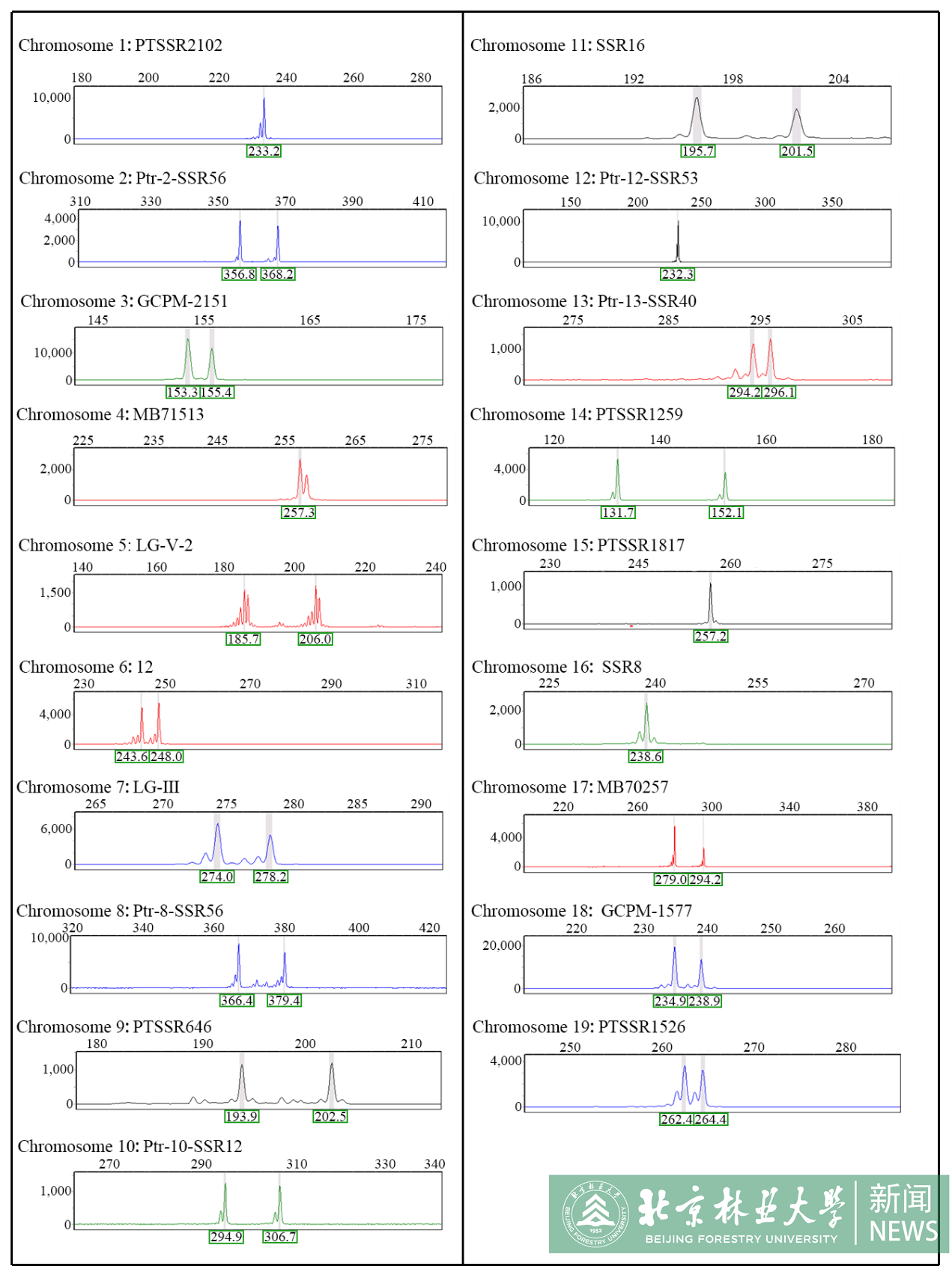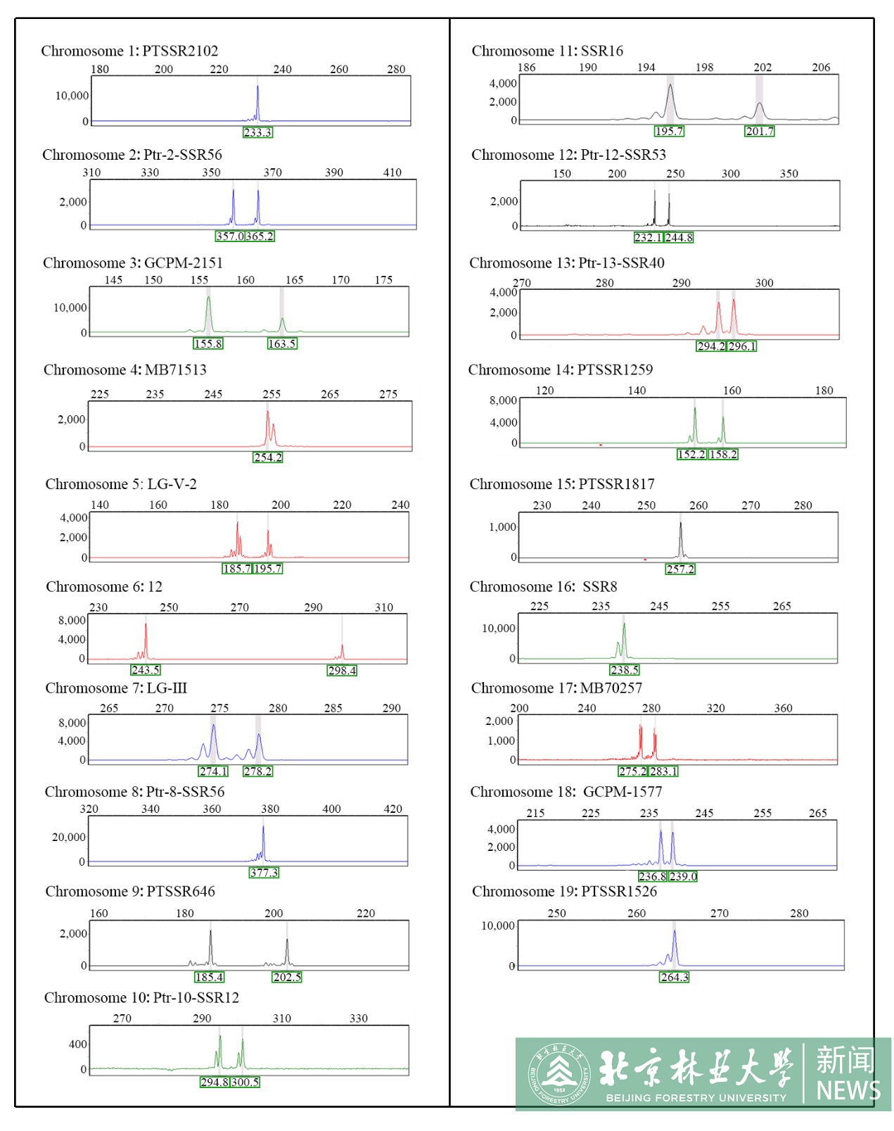初级三体是一种极其重要的遗传工具材料。利用植物初级三体可进行目标染色体替换、分离,可将基因、连锁群定位在特定染色体上,从而构建基因的物理图谱。该研究利用三倍体白杨杂种无性系‘北林雄株1号’花粉母细胞同源染色体联会松散、染色体分离不均衡而导致非整倍性花粉产生的特性,通过银腺杨与‘北林雄株1号’回交,获得393株非整倍性回交子代。进而利用在母本中处于杂合状态且与父本有差异并覆盖杨树全基因组的19对SSR多态性引物,根据各样本各位点的MAC-PR相对等位基因剂量,构建了鉴别杨树非整倍体染色体数目的方法,确定393个回交子代的染色体组成和染色体数目,筛选获得两个疑似初级三体(图1、图2)植株。进一步利用体细胞染色体计数法对2株疑似三体植株进行镜检确认为真正的三体(图3)。