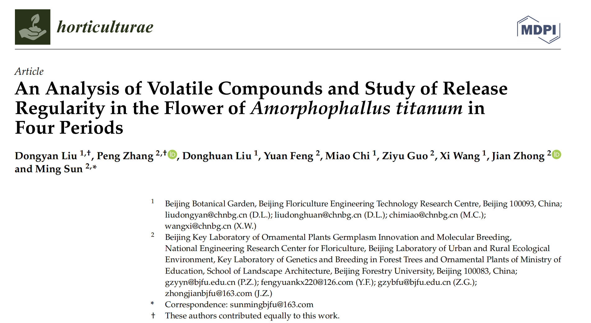 近期,我校园林学院孙明教授课题组联合国家植物园在国际期刊《Horticulturae》上发表了关于巨魔芋开花气味成分研究的文章“An Analysis of Volatile Compounds and Study of Release Regularity in the Flower of Amorphophallus titanum in Four Periods”(《巨魔芋4个时期花朵挥发性成分分析及释放规律研究》),首次探究了巨魔芋花朵4个时期的气味成分含量以及变化规律,揭示了巨魔芋“另类花香”的真实面目 。