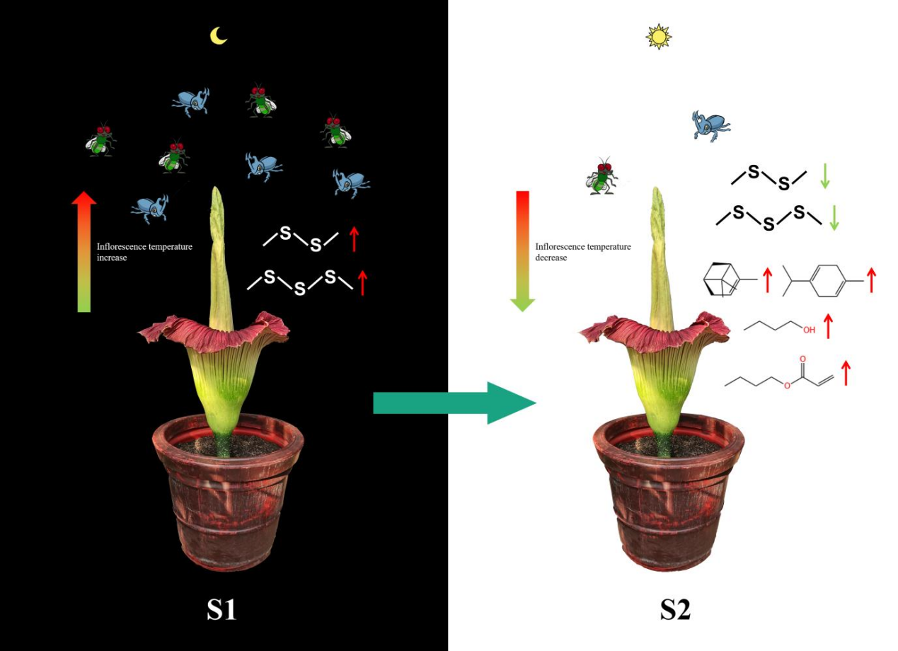 研究结果表明,巨魔芋在开花期间会释放63种挥发物,尤其是盛花期会释放大量的含硫化合物,其中二甲基二硫和二甲基三硫的释放量最大,是巨魔芋花朵产生特殊气味的主要原因。过了盛花期,2种含硫化合物释放量会大幅度降低,巨魔芋花朵的特殊气味也随之变淡。