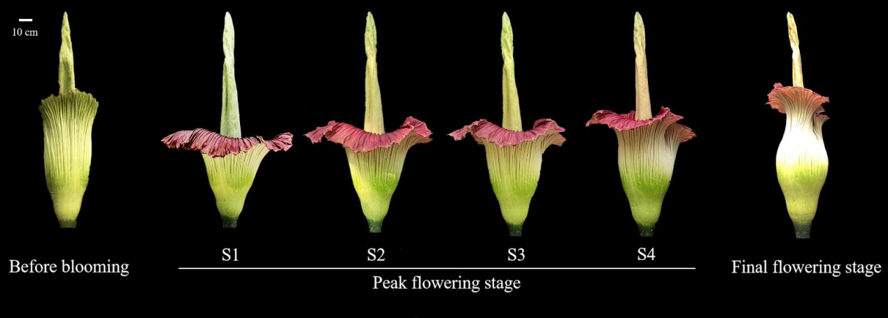 巨魔芋(天南星科 魔芋属)是世界上单体花序最大的植物,因其花朵盛开时会散发一股类似腐肉的恶臭味,同时被人们称为“世界上最臭的花”。巨魔芋花朵的特殊气味是什么,又有什么释放规律呢?