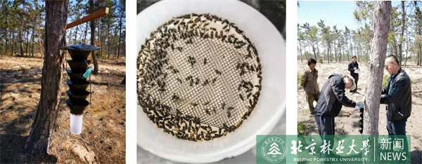 图1 诱捕器悬挂方式(左),诱捕器内大量成虫(中),工作照(右)