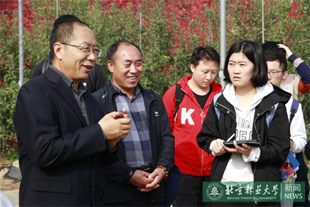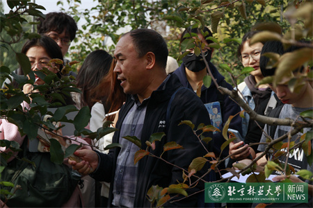 在河北三河市金天地生态园,三河市林草局原副局长路明选向同学们介绍了当地生态园的基本情况,围绕苹果树疏果、病虫害防治以及质量安全管理等内容,进行全面详细讲解,并现场解答了同学们提出的问题。
